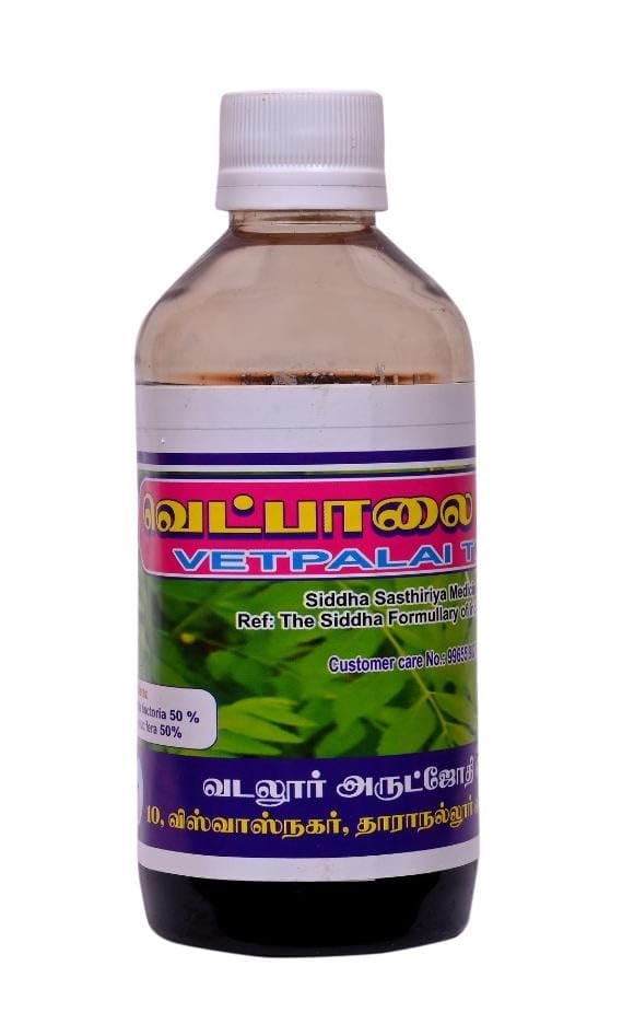 Discover the soothing and therapeutic power of Vetpalai Oil a natural solution to address various skin concerns. Formulated with the finest ingredients this oil is designed to provide relief from itchy skin psoriasis dandruff and an itchy scalp. Key Features: 1.Natural Ingredients: Vetpalai Thailam contains vetpalai leaves(Wrightia Tinctoria) and Coconut oil (Cocos Nucifera ). Wrightia Tinctoria helps to detoxify the skin and it is useful in skin disorders. It is antifungal in nature. 2.Itchy Skin Relief: Vetpalai has been traditionally used for its anti-inflammatory properties making it an effective remedy for relieving itchy skin caused by various conditions. Whether you suffer from dryness redness or irritation Vetpalai Oil provides a calming solution. 3.Psoriasis Support: Manage the symptoms of psoriasis with Vetpalai Oil. The anti-inflammatory and moisturizing properties help soothe the discomfort associated with psoriasis promoting healthier and more comfortable skin. 6.Dandruff Control: Say goodbye to flaky and itchy scalp with Vetpalai Oil. Its nourishing formula helps combat dandruff providing a natural solution for a healthier scalp and hair. Say goodbye to discomfort and hello to healthier skin and hair with Vetpalai Oil. Embrace the power of nature for a confident and soothing skincare routine. Directions for Use: Apply Vetpalai Oil directly to the affected areas. Use regularly for best results.