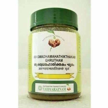 Vaidyaratnam Aragwadhamahathikthakam Ghrutham, For Skin Disorders, 100% Herbal, 150gmVaidyaratnam Aragwadhamahathikthakam Ghrutham is an Ayurvedic formulation. This herbal ghee is traditionally used for skin disorders.Form: GheeType: Herbal supplementIdeal for: Children and adultsGender: Both men and womenPackage content: 150gm in an airtight jarIngredientsVaidyaratnam Aragwadhamahathikthakam Ghrutham is enriched with herbal goodness. The supplement is prepared with the following beneficial herbs.MilkGheeGiloyDabraRaisinsLicoriceShatavariAsh gourdSugarcaneKokilakshaIndian lotusMuskmelonMalabar nutPuncturevineWater hyssopGiant bulrushDrumstick treeCoconut waterIndian barberryCommon juniperWhite bat flowerBlack nightshadeIndian sarsaparillaIndian gooseberryGreater cardamomThree leaved caperMountain knotgrassSal leaved desmodiumCeylon swamp mallowBenefitsVaidyaratnam Aragwadhamahathikthakam Ghrutham may be useful in the following health issues.FistulaEczemaLeprosyChronic ulcersFeaturesVaidyaratnam Oushadhasala was founded in 1941. This Ayurvedic institute is located at Ollur, Kerala. This family-owned business follows Kerala Ayurveda and Ashtavaidya Tradition to manufacture its products. Vaidyaratnam Aragwadhamahathikthakam GhruthamIs 100% herbalIs made with the best quality ingredientsIs not known to have negative effects on the userComes with a long shelf life of 3 years from the date of manufactureDoseVaidyaratnam Aragwadhamahathikthakam Ghrutham should be consumed after consulting an Ayurvedic physician. Generally, the below tips are followed to have the decoction.Take 10-20gm of the ghee per dayHave the supplement once or twice a dayTipsVaidyaratnam Aragwadhamahathikthakam Ghrutham stays fresh and usable for long if the below tips are followed.Store at a cool and dry placeKeep in the provided airtight bottleWarningKeep away from childrenDo not
