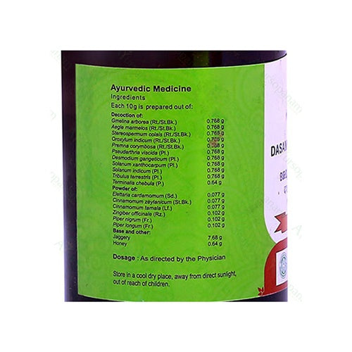 Vaidyaratnam Dasamoolahareethaki Leham, For Genito-Urinary Diseases, Herbal: 250 gmVaidyaratnam Dasamoolahareethaki Leham is an Ayurvedic formulation. This herbal decoction is traditionally used for genito-urinary diseases.Form: JamIdeal for: AdultsType: Herbal supplementGender: Both men and womenPackage content: 250gm in an airtight bottleIngredientsVaidyaratnam Dasamoolahareethaki Leham is enriched with herbal goodness. This all-natural decoction is made withMyrobalanIndian baelAgnimanthaPuncturevineTrumpet flowerIndian nightshadeMalay beechwoodSticky desmodiumSal leaved desmodiumYellow berried nightshadeFeaturesVaidyaratnam Oushadhasala was founded in 1941. This Ayurvedic institute is known for its wide range of herbal supplements. Vaidyaratnam is a family-based business. They follow Ashtavaidya tradition and Kerala Ayurveda to manufacture its products. Vaidyaratnam Dasamoolahareethaki LehamIs herbalIs made with the best quality ingredientsComes with a long shelf life of 12 months from the date of manufactureDoseVaidyaratnam Dasamoolahareethaki Leham should be consumed after consulting an Ayurvedic physician. Generally, the below steps are followed to have the decoction.Take 10-20gm of the Jam per dayHave the decoction once or twice dayMix the jam with lukewarm waterTipsVaidyaratnam Dasamoolahareethaki Leham stays fresh and usable for long if the below tips are followed.Store at a cool and dry placeKeep in the provided airtight containerWarningKeep away from childrenKeep away from direct sunlightDo not exceed the recommended doseLegal Disclaimer: Statements regarding dietary supplements have not been evaluated by the FDA and are not intended to diagnose, treat, cure, or prevent any disease or health conditionNote: The product is guaranteed to be 100% genuine. Product ima
