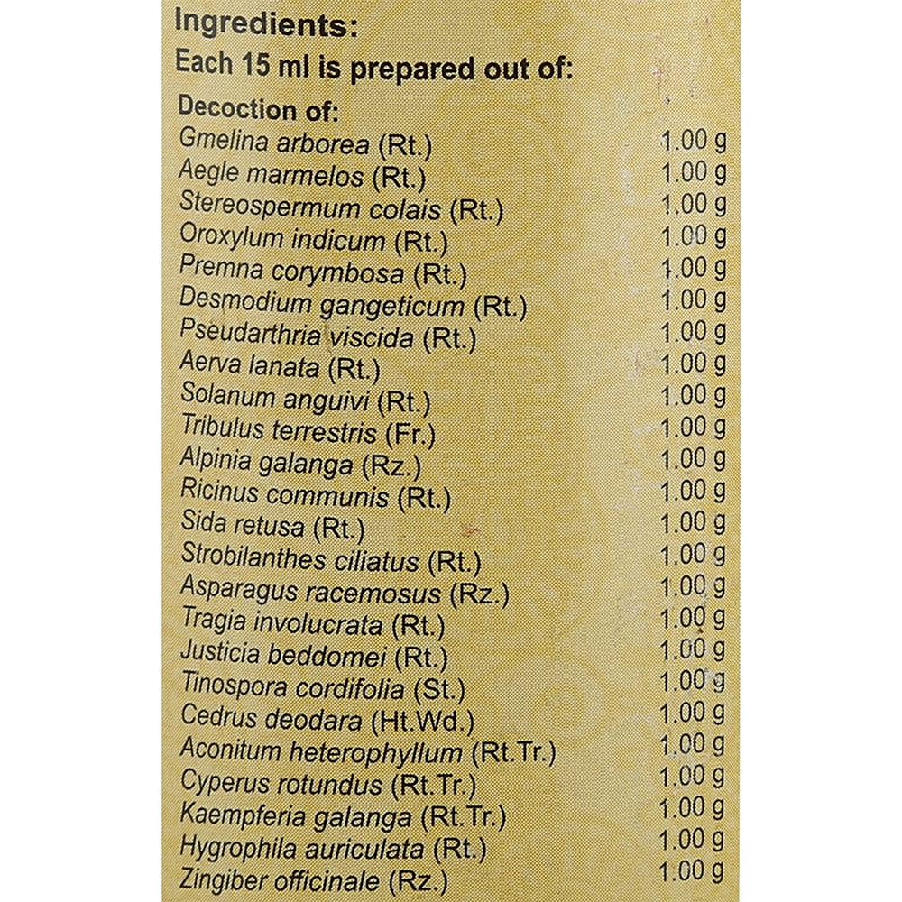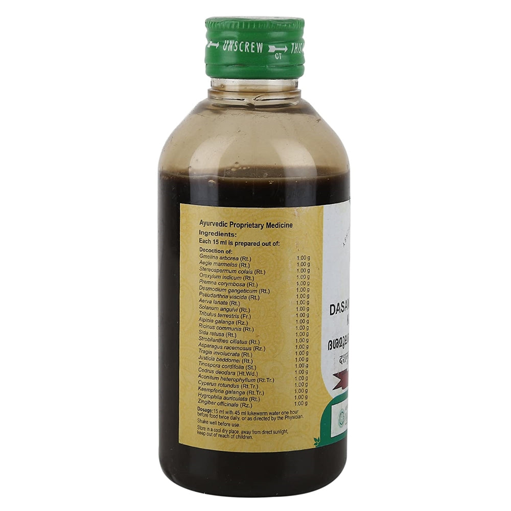 Vaidyaratnam Dasamoolarasnadi Kashayam, For 100% Herbal, 200mlVaidyaratnam Dasamoolarasnadi Kashayam is a classic Ayurvedic formulation. Form: LiquidIdeal for: AdultsType: Herbal supplementGender: Both men and womenPackage content: 200ml in an airtight bottleIngredientsVaidyaratnam Dasamoolarasnadi Kashayam is an organic supplement. This preservative-free supplement is made withRottlerSatawariJelly leafNutgrassSnake treeIndian ateesBeechwoodPuncturevineMarsh BarbelLesser kurinjiCanton gingerStinging nettleSiamese gingerCastor oil plantAromatic gingerShal leafed bushAfrican eggplantHimalayan cedarSticky desmodiumMountain knotgrassIndian trumpet flowerJapanese bitter orangeWillow leaved justiciaHeart-leaved moonseedBenefitsVaidyaratnam Dasamoolarasnadi Kashayam is known for its anti-inflammatory properties. This herbal potent is may helpful forOedemaFeatureVaidyaratnam Oushadhalaya is an established name in the market of herbal wellness products. The brand is known for its wide range of Ayurvedic supplements, prepared under hygienic environment. Vaidyaratnam Dasamoolarasnadi KashayamIs 100% herbalIs made with the best quality ingredientsIs not known to have any negative effects on the bodyComes with a long shelf life of 24 months from the date of manufactureDoseVaidyaratnam Dasamoolarasnadi Kashayam should be consumed after consulting a physician. Generally, the below steps are followed to have thisHave the tonic twice a dayDrink 15ml of tonic everydayMix with 45ml lukewarm waterDrink the decoction 1 hour before mealsTipsVaidyaratnam Dasamoolarasnadi Kashayam stays fresh and edible for long if the below tips are followed.Store at a cool and dry placeWarningShake well before useKeep away from childrenDo not expos