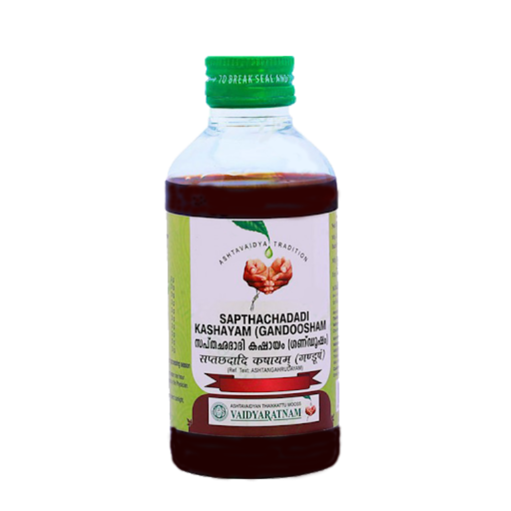 Vaidyaratnam Sapthachadadi Kashayam (GANDOOSHAM) : 200 MlVaidyaratnam Sapthachadadi Kashayam is an Ayurvedic formulation. This herbal supplement is traditionally useful in oral infections.Form: LiquidColor: BrownType: Herbal supplementIdeal for: Children and adultsGender: Both men and womenPackage content: 200ml in an airtight bottleIngredients :Vaidyaratnam Sapthachadadi Kashayam is an all-natural supplement. This herbal decoction is made withVetiverLicorice rootPointed gourdGolden showerBlackboard treeCommon nutsedgeWhite Indian sandalwoodYellow berried nightshadeBenefits :Vaidyaratnam Sapthachadadi Kashayam may be useful in healthy mouth freshness.Features :Vaidyaratnam Oushadhasala was founded in 1941. This Ayurvedic institute is known for its high-quality herbal supplements. Located at Ollur, Kerala, the brand follows Kerala Ayurveda and Ashtavaidya tradition to manufacture the products. Vaidyaratnam Sapthachadadi KashayamIs a bio-safe productIs made with the best quality ingredientsIs not known to have negative effects on the userComes with a long shelf life of 12 months from the date of manufactureDose :Vaidyaratnam Sapthachadadi Kashayam should be consumed after consulting an Ayurvedic physician. Generally, the below steps are followed to have the decoction.Have the tonic twice a dayHave the decoction before mealsTake 5-15ml of the tonic per dayMix 15-45ml of lukewarm water with the tonic before consumptionTips :Vaidyaratnam Sapthachadadi Kashayam stays fresh and usable for long if the below tips are followed.Shake well before useStore at a cool and dry placeWarning :Keep away from childrenDo not expose to direct sunlightDo not exceed the recommended doseColor of the product may vary depending on the processing seasonLegal Disclaimer: Statements regarding dietary supplements have not been evaluated by the FDA and are not intended to diagnose, treat, cure, or prevent any disease or health conditionNote: The product is g