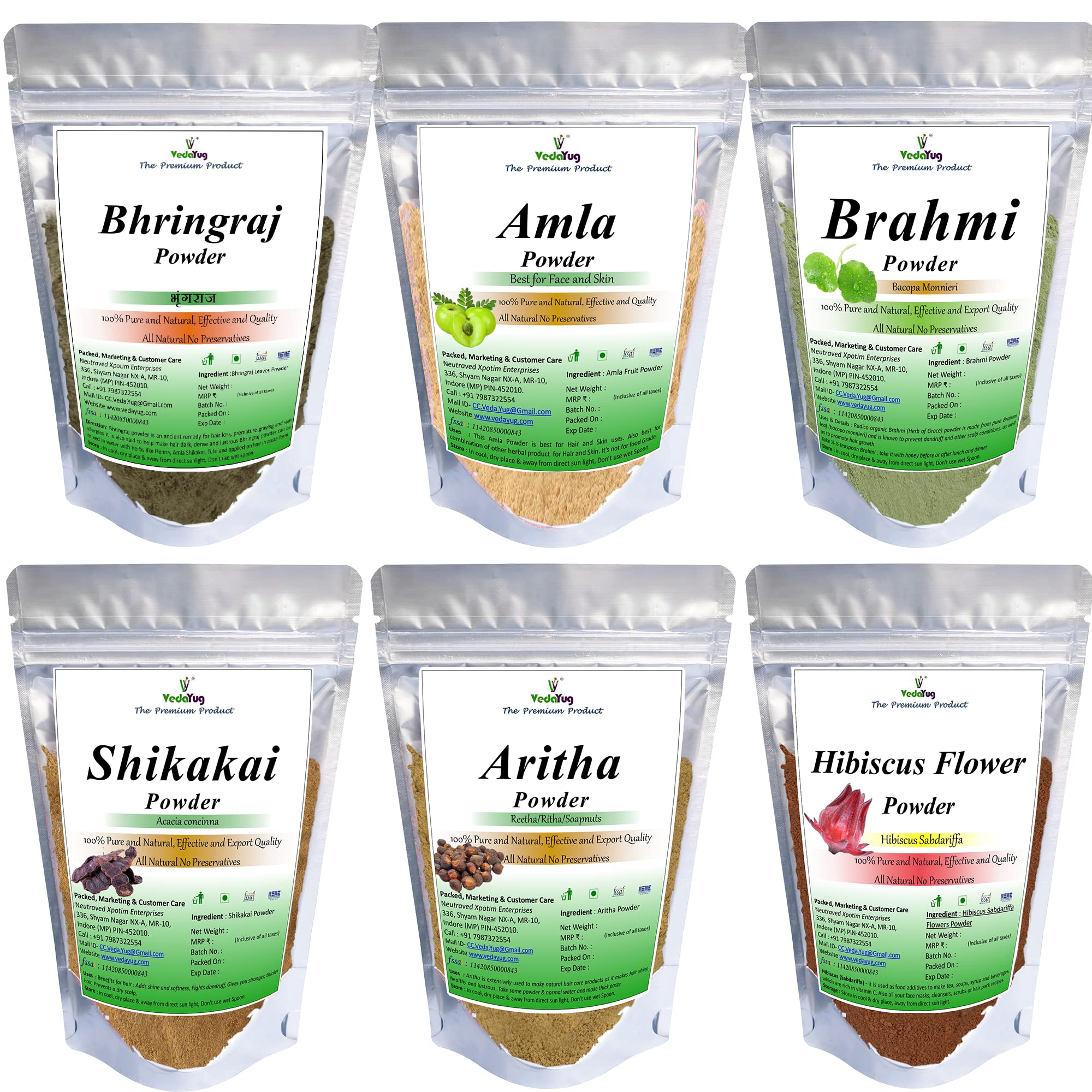 VY VedaYug Amla Reetha Shikakai Bhringraj Hibiscus & Brahmi Powder | Combo Powder Pack for Hair Care & Mask | Cleansing & Hair Conditioning For Oily Hair (Pack of 6 100g Each Total 600g)6 Count