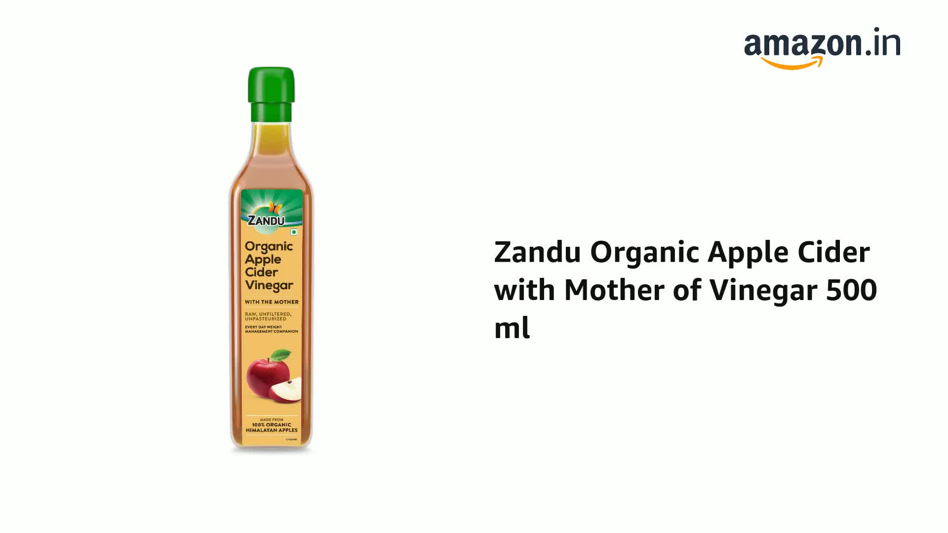 Zandu Organic Apple Cider Vinegar is made from the rich cold-press juice of 100% organic apples found in the Himalayas and is prepared with the goodness of mother of vinegar which is considered to be the purest form of the vinegar. Apple Cider is a juice that's generally extracted from pressing fresh-cut and mashed apples. Zandu's all-natural and organic Ayurvedic drink helps manage essential modern-day needs like weight related challenges immunity and gut health. Regular consumption of Zandu's unfiltered and unpasteurized Organic Apple Cider Vinegar has been known to be useful in promoting healthy skin and helps in detoxification. This Organic Apple Cider Vinegar comes with the effectiveness of the Mother of the vinegar giving it a cloudy translucent appearance and making it a vital powerhouse of good bacteria that supports overall health and wellbeing. Zandu Organic Apple Cider Vinegar is specially prepared with NO added sugar salt artificial flavors and colors. Zandu brings to you the pure richness of Apple Cider Vinegar with an Ayurvedic and organic formulation with more than 100 years of legacy & wisdom to be your everyday weight & health management companion.
