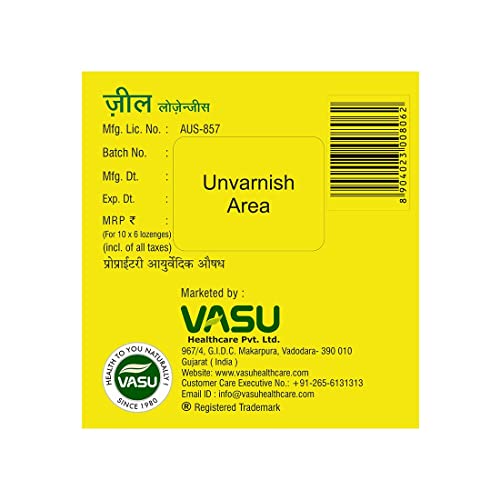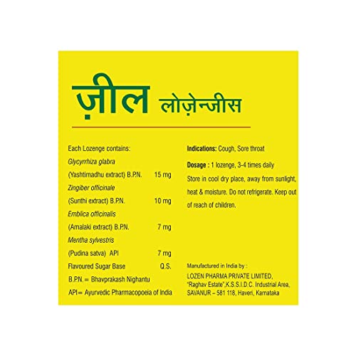 Product Description: Carrying cough syrup while you travel cab ne inconvenient Zeal Lozenges provide solution to this problem. Separately packed each lozenge is full of power to provide relief from cough and throat irritation. Aamla in Zeal Lozenges fights throat infections. Ginger one of the bestremedies for throat problems with added power of Yashtimadhu. Gingerhas anti emetic properties making it useful during pregnancy travel sickness andfor bad taste in mouth.An Excellent remedy for throat infections with power of Yashtimadhu Aamlaand Ginger. Salient Features: Convenient Lozenges pack Tasty and effective Useful in Sore throat and motion sickness KEY INGREDIENTS: YASHTIMADHU AMLA SUNTHI PUDINA PACK SIZE: Strip pack of 6 x 10 lozenges HOW TO USE? To be taken as per advice of registered medicinal practitioners in Sore Throat/ Irritation in Throat and All types of Cough