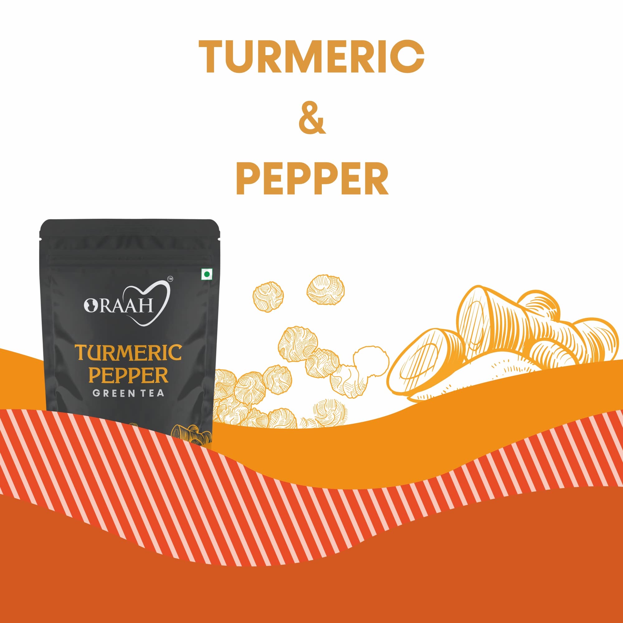 Oraah Turmeric Pepper green tea for happy gut and cleansing with Turmeric and Blackpepper. 100% Natural Ingredients. Make this part of your health by ideally drinking 2 cups a day.