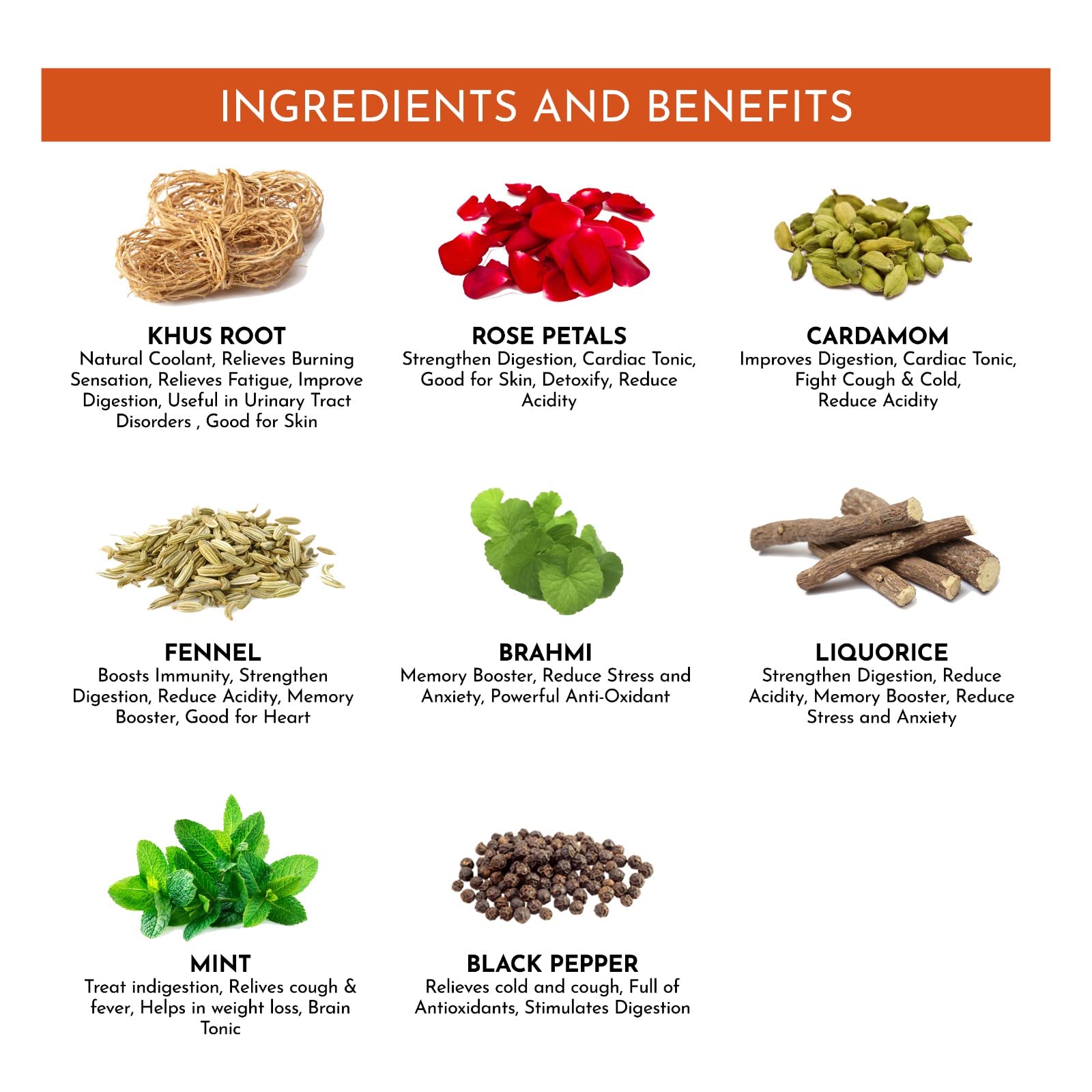 Eight Potent Herbs: Khus Root (Vetiver) Rose Petals Fennel Liquorice Cardamom Mint Brahmi Pepper