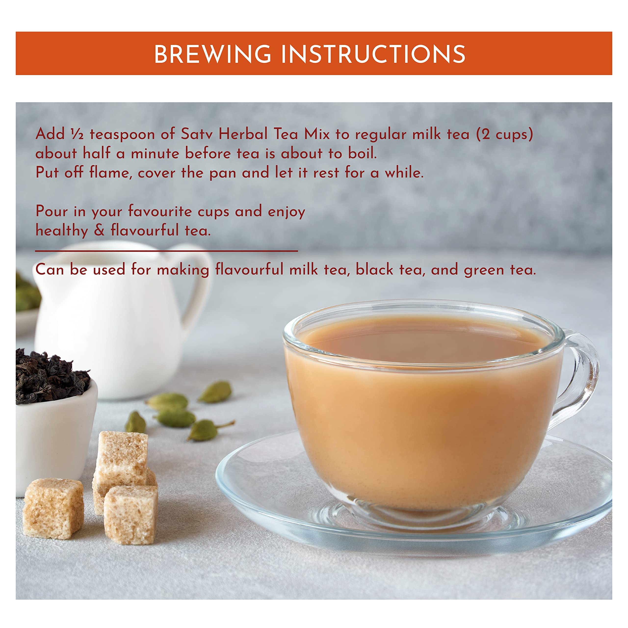 Easy to use: Add ½ teaspoon of Satv Herbal Tea Mix to regular milk tea (2 cups) about half a minute before tea is about to boil. Put off flame cover the pan and let it rest for a while. Can be used for making milk tea black tea and green tea.
