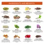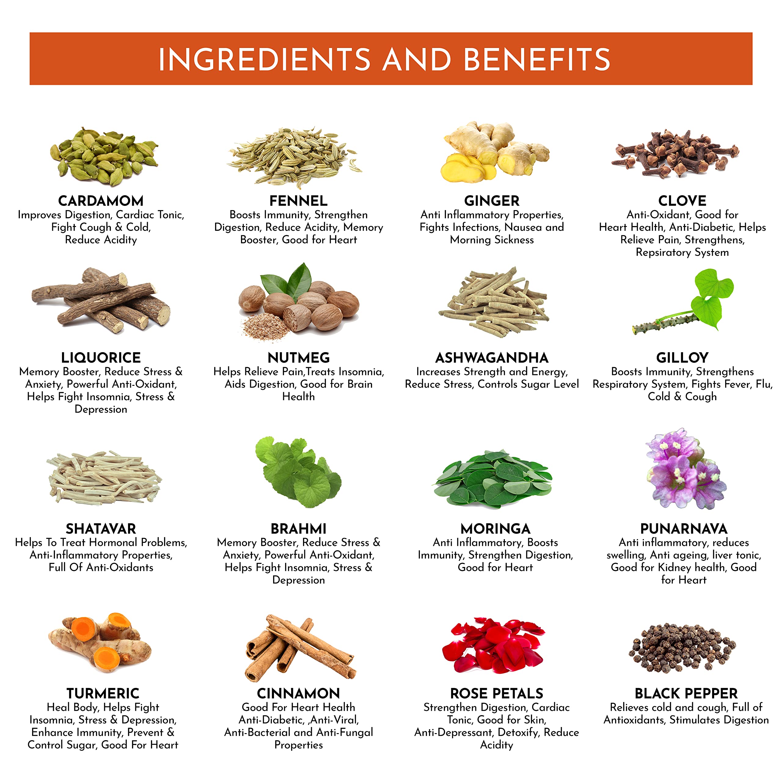 16 Potent herbs: Cardamom Fennel Ginger Clove Cinnamon Pepper Nutmeg Rose Petals Liquorice Moringa Brahmi Ashwagandha Gilloy Turmeric Punarnava Shatavar