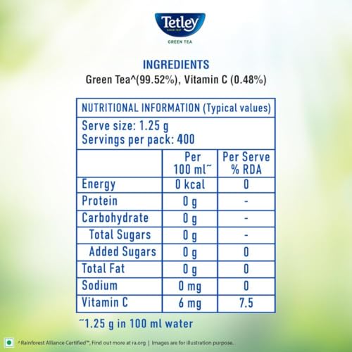 Start afresh with Tetley! To stay refreshed all day sip the refreshing Tetley Long Leaf Green Tea. Being an excellent source of antioxidants Tetley Green Tea has various beneficial effects on health such as it helps you feel relaxed by hydrating your body and flushes out all the toxins from your body. The finest and long tea leaves are blended for a smooth and soft taste with an all-natural green tea flavor. You can now enjoy freshness whenever and wherever you want such as after breakfast before exercise or before bedtime. USAGE INSTRUCTIONS: Add just ½ tbsp. of Green Tea Leaves to boiling water. Brew the tea for 2 minutes. Add honey if desired & enjoy the perfect green tea!