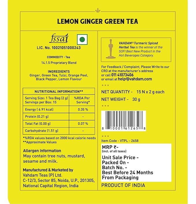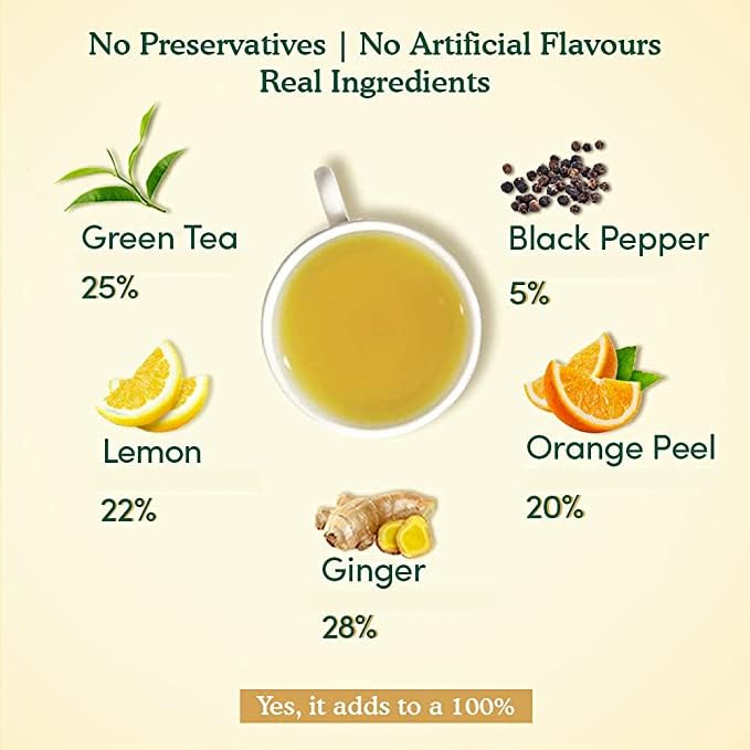 VAHDAM, Lemon Ginger Green Tea Bags (15 Count) Med Caffeine, Non-GMO, Gluten-Free | Fruity Flavor - Zesty Lemon & Orange Peel | Individually Wrapped Pyramid Tea Bags | Direct from Source