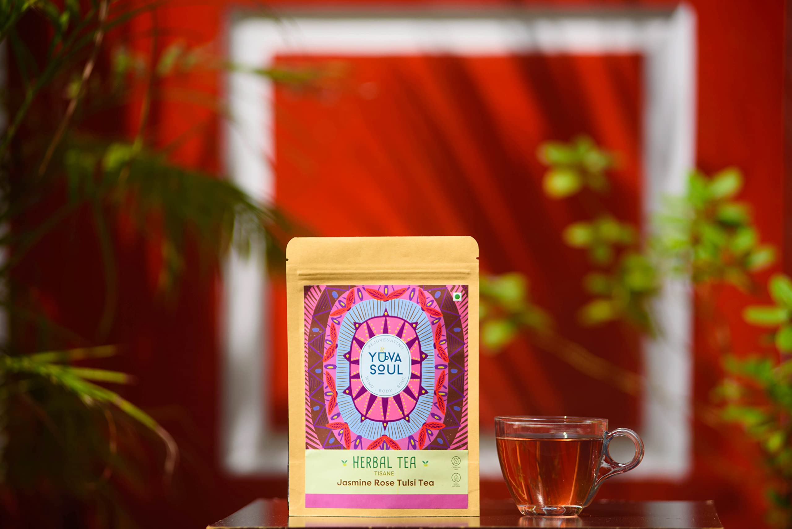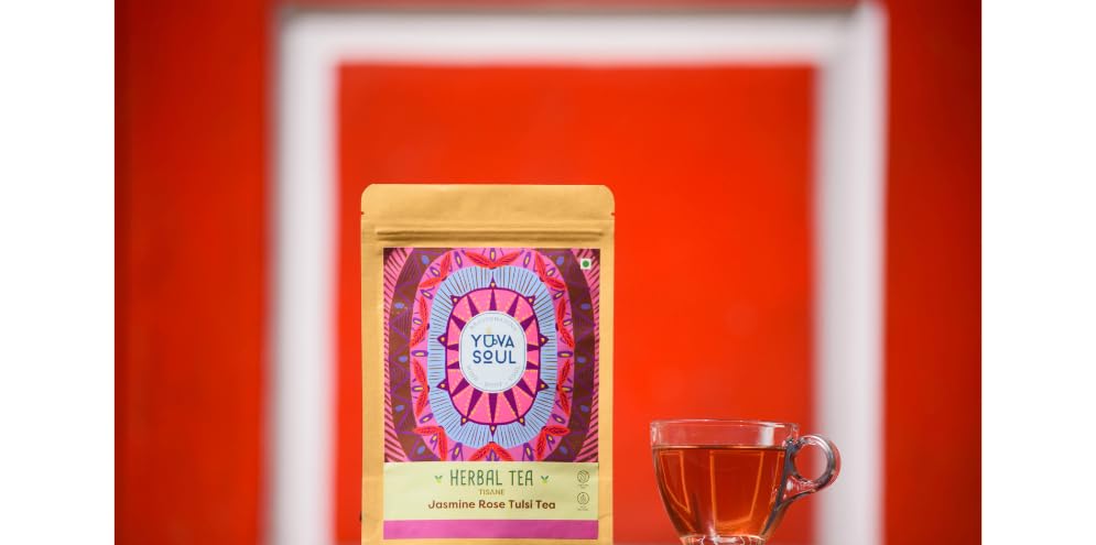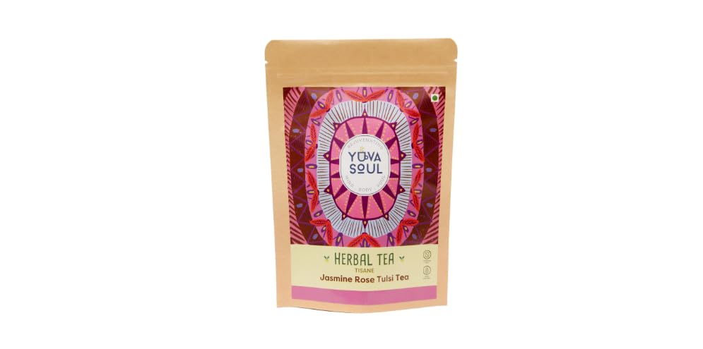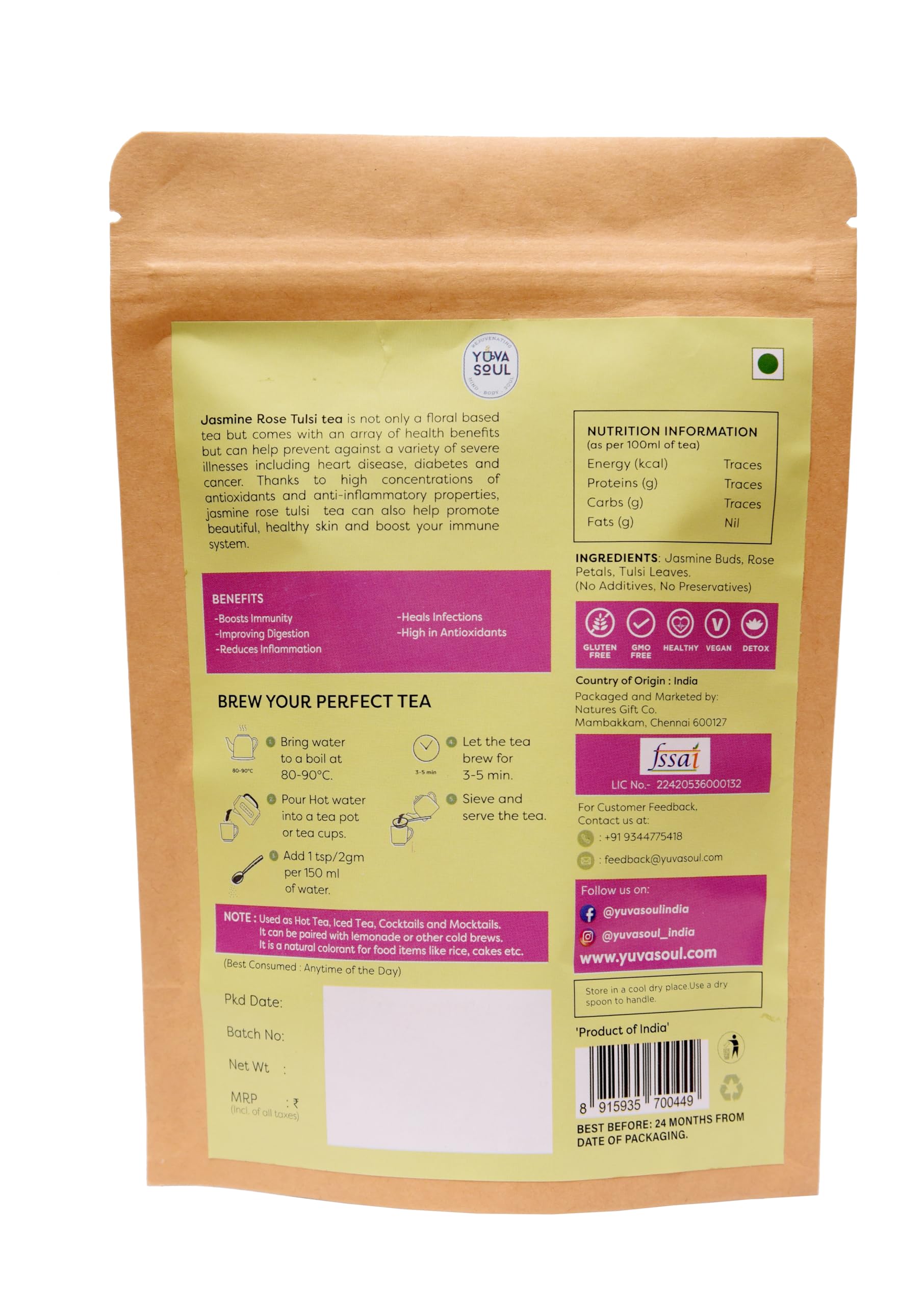 YUVA SOUL Jasmine Rose Tulsi tea is a floral based tea which not comes with an array of health benefits. Jasmine is rich in anti-oxidants which delay the signs of aging. Promotes inch loss and weight loss. Rose is herbal and is known to improve digestion system. As a healthy digestive system is important for weight loss drinking a cup or two of rose tea support weight loss. Tulsi (also known as Holy Basil) makes a delicious and refreshing tea that possesses wonderful health benefits that support the body's natural immune system while relieving the body's negative reaction to stress.