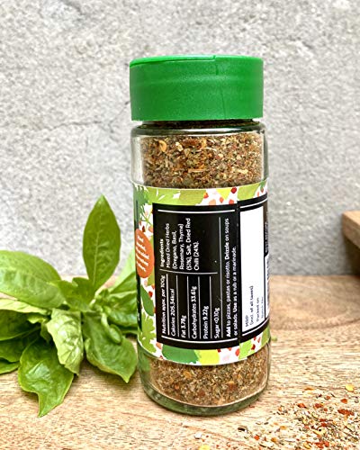 Fragrant & Spicy | A blend of basil oregano rosemary & thyme with chilli flakes. Add to to pizzas pastas or risotto. Drizzle on soups or salads Use as a rub or a marinade. Ingredients- Mixed dried herbs (Oregano basil rosemary thyme) Pink Himalayan Salt Dried Red chilli Shelf life- 12 Months from date of packaging. We take care that products sent out are from the freshest batch. Storage Instructions: Keep in a cool dry place. Net Weight 55g