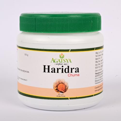 Haridra, popular as Turmeric is one of the most commonly used herb both externally as well as internally. It is an auspicious drug in Indian tradition. Its mere touch has boundless benefits. This versatile herb is being used in culinary, cosmetic as well as a home remedy for common cold, wounds and various other ailments. This golden wonder is also used as a dietary supplement with numerous health benefits. In Ayurveda it has been successfully implemented in preventive and curative aspects of many diseases such as Diabetes. It detoxifies blood and skin.Botanical name: Curcuma longa LinnFamily: Scitamineae (Zingiberaceae)The dried rhizome is used to make Haridra churna.Rasa: Tikta, KatuGuna: Ruksha, LaghuVeerya: UshnaVipaka: KatuPacifies Vata and Kapha dosha.Agatsya Haridra Churna Benefits:· It is said to be the best herb for treating Diabetes· A Varnya ie increases complexion; treats a wide range of skin disorders, itching, allergies.· Accelerates quick wound healing· Relieves worm infestations· Treats various respiratory conditions like rhinitis, cold, cough· It promotes digestion, supports brain and nervous system, nourishes liver· Useful in Anaemia· Haridra is utilized in various formulations for inflammatory conditions· Effective antidote for various poisons, insect bites.· Treats Urinary tract disorders· Relieves constipation.