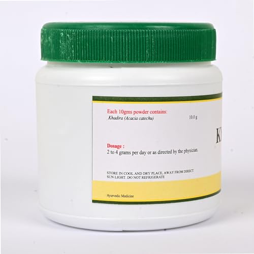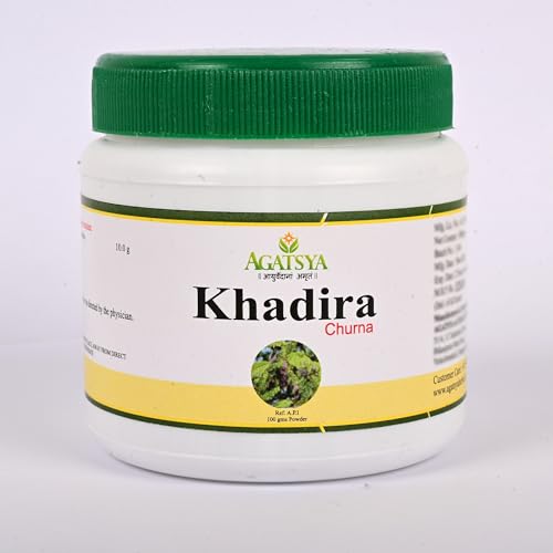 Khadira is one of the important tree both of rituals and medicinal usage. Acharya Charaka has described it as one of the best drug for skin ailments. Literally it means the one which cures disease and brings stability to the body. Khadira is a natural Skin tonic, used in all types of skin diseases.Botanical name: Acacia catechuFamily: MimosoideaeThe dried heartwood is used to make powder.Rasa: Tikta, KashayaGuna: Laghu, RukshaVeerya: SheetaVipaka: KatuBalances Kapha and Pitta dosha.Agatsya Khadira Churna benefits:· A potent blood purifier, treats a wide range of skin disorders including Leucoderma, relieves itching· Improves quality of teeth· Treats Diabetes and Urinary tract disorders, Anemia· Checks bleeding disorders· Treats cough, cold, fever· Used to treat indigestion· Relieves inflammation· Treats worm infestation· Useful in obesity.