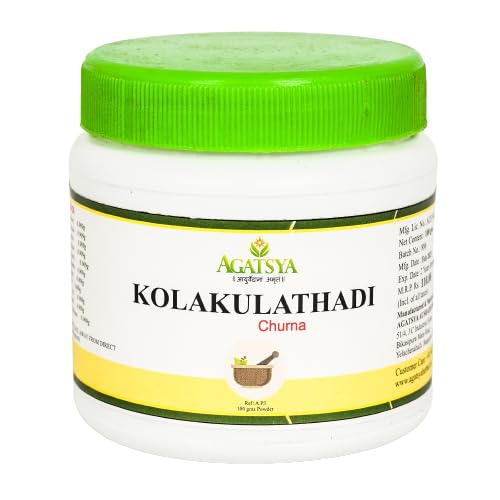 Agatsya Kolakulathadi Churna is a polyherbal formulation prepared by mixture of various Ayurvedic herbs. It is used as an external application to reduce pain and inflammation in joints and muscles hence helpful in conditions such as Backache, Lumbago, Sciatica and Muscular Sprain.It can be used for Udvartana(Powder Massage) which in turn helps to reduce the body fat.Ingredients:KolaKulatthaDevadaruRasnaMashaAtasiKushtaVachaShatahvaYavaTailaphala