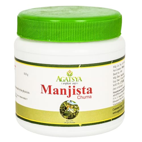 Manjista is the quintessential blood purifier in the Ayurvedic pharmacopoeia. It is a natural anti oxidant helping to support healthy skin and clear complexion. It is one of the best Pitta pacifying herb that can be used both externally and internally. It is used to support the proper functioning of the liver and kidneys.Botanical name: Rubia cordifolia LinnFamily: RubiaceaeUseful part: Stem barkRasa: Tikta, Kashya, MadhuraGuna: Guru, RukshaVeerya: UshnaVipaka: KatuBalances vitiated Kapha and Pitta dosha.Agatsya Manjista Churna benefits:A boon in wide array of skin disordersTopical application improves skin complexionAids quick wound healingTreats toxic and inflammatory conditions, injuries and woundsUseful in gynaecological, bleeding disordersVery helpful in Diabetes and Urinary tract disordersManages Diarrhoea