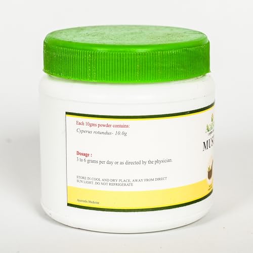 Musta is considered one of the eminent herb to promote healthy and regular menstruation. It promotes digestion, eliminates natural toxins and supports proper functioning of the liver. Its cooling and cleansing action supports healthy skin and helps to maintain normal body temperature.Botanical name: Cyperus rotundus Linn.Family: CyperaceaeUseful part: TuberRasa: Tikta, Katu, KashayaGuna: Laghu, RukshaVeerya: SheetaVipaka: KatuBalances vitiated Kapha and Pitta dosha.Agatsya Musta Churna benefits:· One of the best herb in fever management· Useful in indigestion and improves digestive strength, treats diarrhoea· Relieves worm infestation and aids quick wound healing· Subsides excessive thirst,"· Treats Cough, Asthma,"· Sthanya Vikara : Treats various breast diseases· Improves lactation· Sutika Roga : Treats post delivery disorders in women.