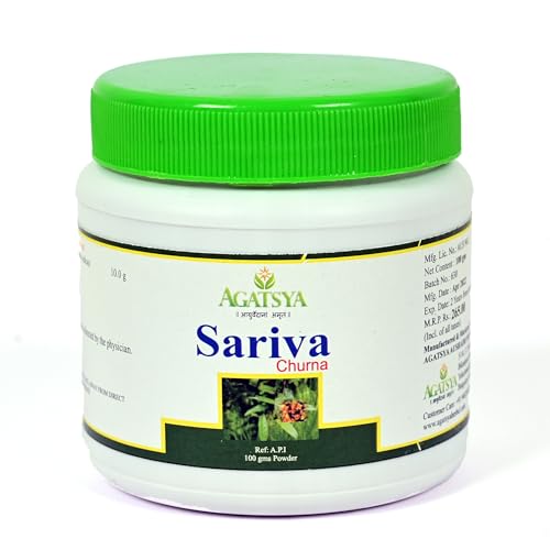 Sariva also known as Anantamula is an excellent remedy for a wide range of blood and skin disorders.Sariva is a natural detoxifier and very effective blood purifier. It helps in managing various disorders of female reproductive system.Botanical name: Hemidesmus indicusFamily: AsclepidaceaeUseful part: RootRasa: MadhuraGuna: guru, SnigdhaVeerya: SheetaVipaka: MadhuraBalances Vata, Pitta and Kapha doshas.Agatsya Sariva Churna benefits:· Highly beneficial in skin diseases· Aids digestion· Treats fever· Used in the management of Diabetes and Urinary tract disorders· Improves sperm quality and quantity· Treats diarrhoea , dysentery· Supports the respiratory system· Manages toxic conditions· Treats Menorrhagia.