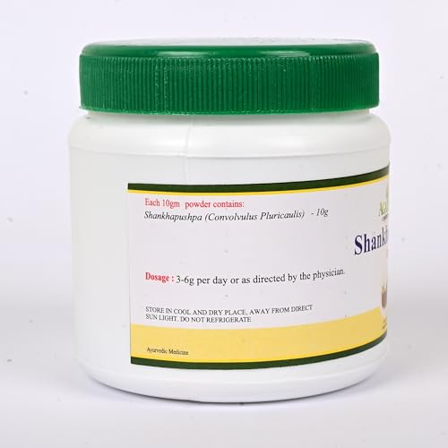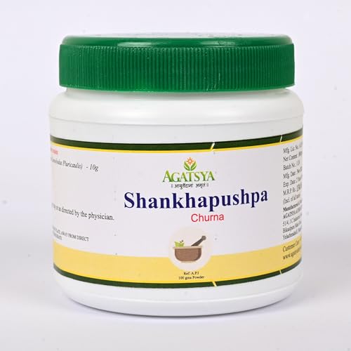 Shankhapushpi is an eminent Medhya rasayana ie brain tonic as it enhances memory, concentration and intelligence. Therapeutically it is beneficial in conditions of vomiting and toxicity.Botanical name: Convolvulus pluricaulis ChoisFamily: ConvolvulaceaeUseful part: Whole plantRasa: TiktaGuna: Snigdha, PicchilaVeerya: SheetaVipaka: MadhuraBalances vitiated Pitta and Kapha.Agatsya Shankhapushpi Churna benefits:· Brain tonic· Rasayana- Anti ageing· Aphrodisiac· Treats respiratory disorders· Used in the management of Anxiety, High blood pressure, Insomnia, Epilepsy, Schizophrenia and Depression.· Improves digestion and overall strength· Improves memory hence useful in conditions of dementia· Treats intestinal worms.