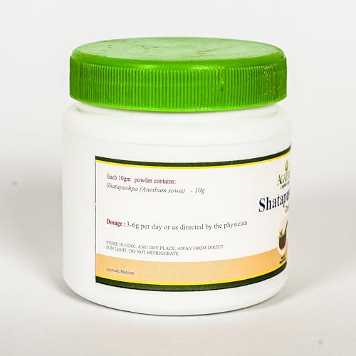 Shatapushpa commonly known as Dill is an ancient spice used from generations. It possesses carminative, analgesic, antiemetic properties, hence aids in proper digestion and cures colicky pain. It also possess antioxidant, antiseptic, anti inflammatory properties. It is used in conditions such as Fever, Eye disorders, Diarrhoea. It helps to boost the immunity and also promotes healthy lactation in mothers.Botanical name: Anethum sowaFamily: UmbelliferaeUseful part:SeedsRasa: Katu, TiktaGuna: Laghu, TikshnaVeerya: UshnaVipaka: KatuBalances Vata and Kapha dosha.Agatsya Shatapushpa Churna benefits:· Very beneficial for female disorders· Improves digestive strength· Used in the management of fever· Fastens wound healing· Relieves abdominal colic· Treats Eye disorders· Utilized in Panchakarma procedures.