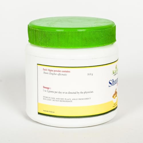 Shunti is titled as Vishvabhesaja ie the universal medicine, for its broad range of health promoting benefits. It is one of the extensively used herb in Ayurveda.Commonly known as Ginger, is a part of various cuisines. It is specifically used for digestive disorders and inflammatory conditions. It is one among the Trikatu ie group of pungent herbs.Botanical name: Zingiber officinaleFamily: ScitamineaePart used: RhizomeRasa: KatuGuna: Guru,Ruksha, TikshnaVeerya: UshnaVipaka: MadhuraPacifies Vata and Kapha doshas.Agatsya Shunti Churna benefits:· An appetizer, relieves anorexia· Cleanses and clears the tongue, improves voice· Ginger promotes healthy expectoration and eliminates excess Kapha, Useful in treating respiratory conditions like cough,cold, asthma· Traditionally used in treatment of fever, anaemia, liver disorders, piles, wounds, skin disorders· Acts as a Cardiac tonic. It supports healthy circulation, vasodilatation.· It is digestive, treats abdominal distension,colic and vomiting, relieves constipation· An aphrodisiac· Useful in inflammatory conditions like Arthritis.