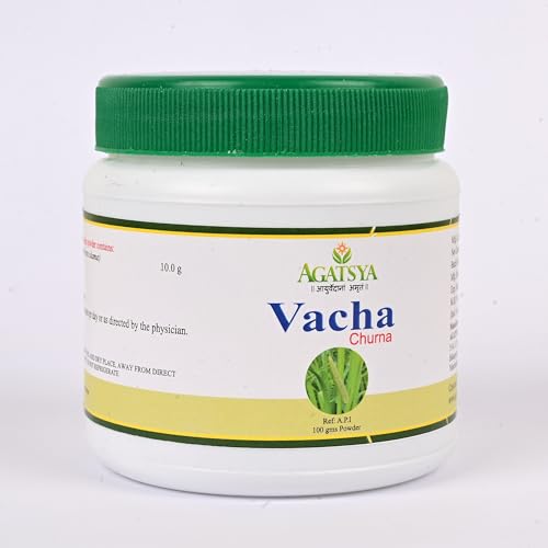 Vacha means speaking clearly because this herb stimulates intelligence and expression. It is one of the eminent Medhya ie brain tonic in Ayurveda. Vacha improves memory, cognition, intelligence, voice and other mental abilities.Botanical name: Acorus calamus Linn.Family: AraceaeUseful part: RhizomeRasa: Katu, TiktaGuna: Laghu, TikshnaVeerya: UshnaVipaka: KatuBalances Kapha and Vata doshaAgatsya Vacha Churna benefits:· Improves intelligence,"· Enhances speech, improves voice, treats throat disorders· A digestive, treats abdominal colic, gaseous distention, constipation· Treats psychosomatic disorders· Anti microbial· Treats fever· Relieves neuralgia, used in treating conditions such as Paralysis, Syphilis.