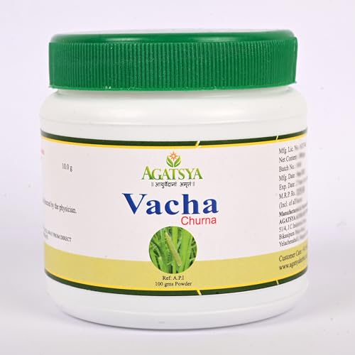 Vacha means speaking clearly because this herb stimulates intelligence and expression. It is one of the eminent Medhya ie brain tonic in Ayurveda. Vacha improves memory, cognition, intelligence, voice and other mental abilities.Botanical name: Acorus calamus Linn.Family: AraceaeUseful part: RhizomeRasa: Katu, TiktaGuna: Laghu, TikshnaVeerya: UshnaVipaka: KatuBalances Kapha and Vata doshaAgatsya Vacha Churna benefits:· Improves intelligence,"· Enhances speech, improves voice, treats throat disorders· A digestive, treats abdominal colic, gaseous distention, constipation· Treats psychosomatic disorders· Anti microbial· Treats fever· Relieves neuralgia, used in treating conditions such as Paralysis, Syphilis.
