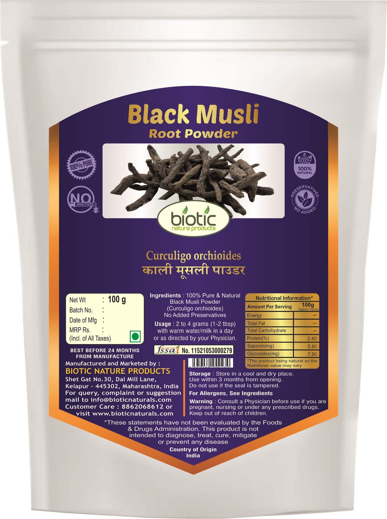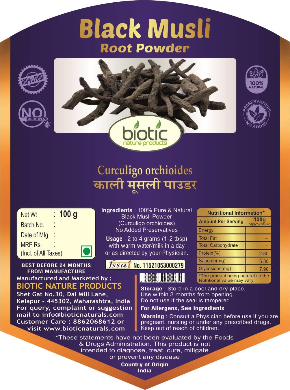 We the âBiotic Nature Productsâ are Online Supplier of Natural and Herbal Powders and also Raw Herbs. We believe in dealing quality products. In a short span time we have over 3 lacs satisfied customers all over India. We supply quality produce that too at very competitive rates to retail customers. Hence now a days we are considered at first few top-most suppliers on e-commerce sites. Biotic Nature Products is a leading Manufacturer Supplier in India of Herbal product Biotic Natural Black Musli Powder - Kali Musli Powder - Curculigo orchioides - 100 gm