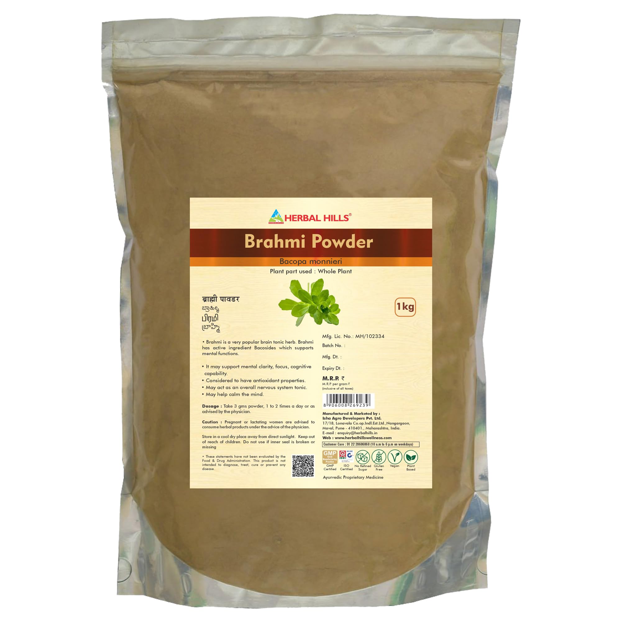 Brahmi powder acts as an overall nervous system tonic. It comes in a quantity of 1 kg.