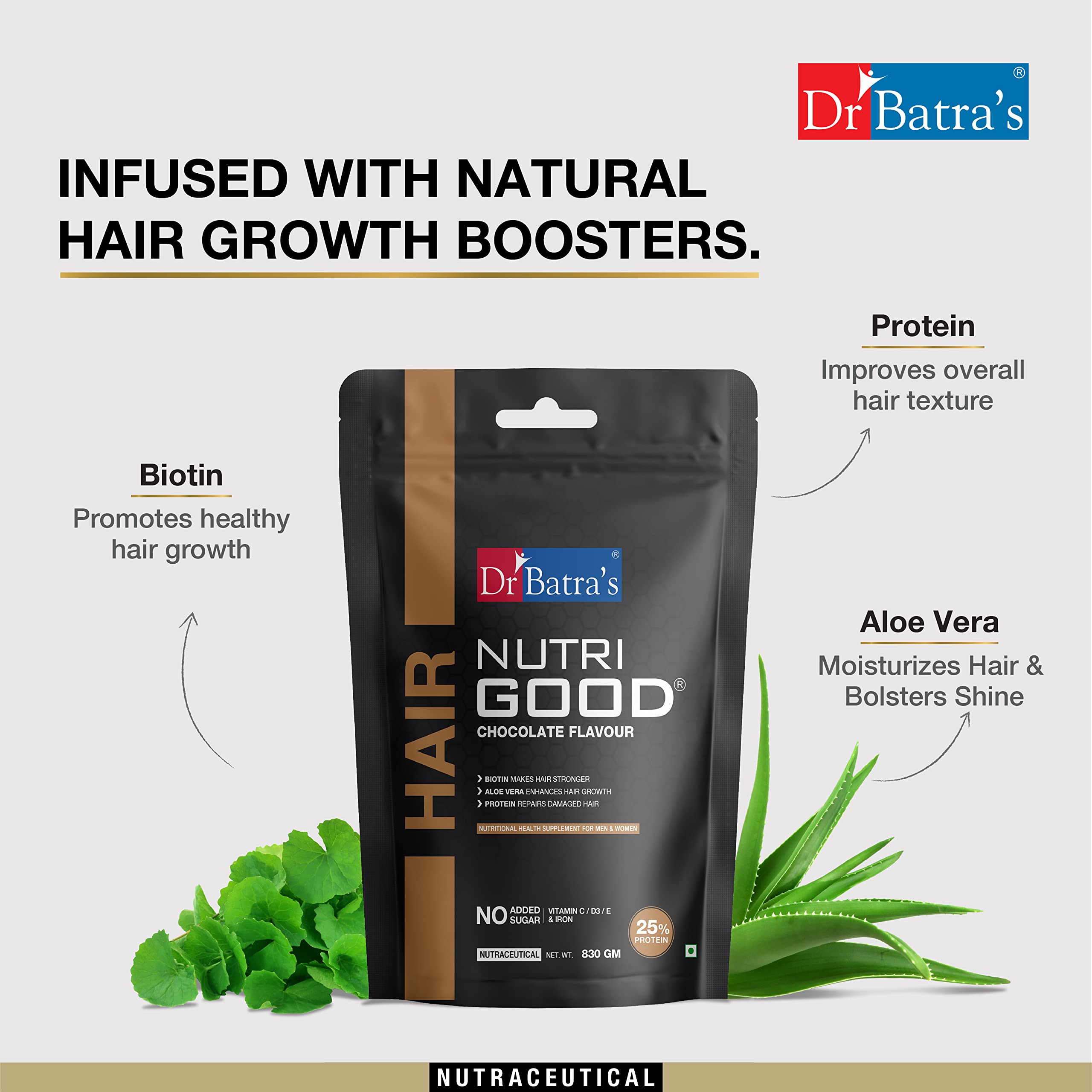 Dr Batra's range of Nutrigood comes in a delicious chocolate flavor you cannot resist. What's more it is a plant-based protein devoid of chemic. Power-packed with vitamins for hair growth it is a hair supplement for brittle dry and lumpy hair. It consists of natural ingredients that are a powerhouse of anti; Brahmi or Bacopa Monnieri Powder and Aloe Vera so now you don't have to worry about the stubborn flaking of the scalp that refuses to go away. This hair supplement o consists of Vitamin E Vitamin B12 Vitamin A and Vitamin C making it one of the best supplements for hair growth and thickness.