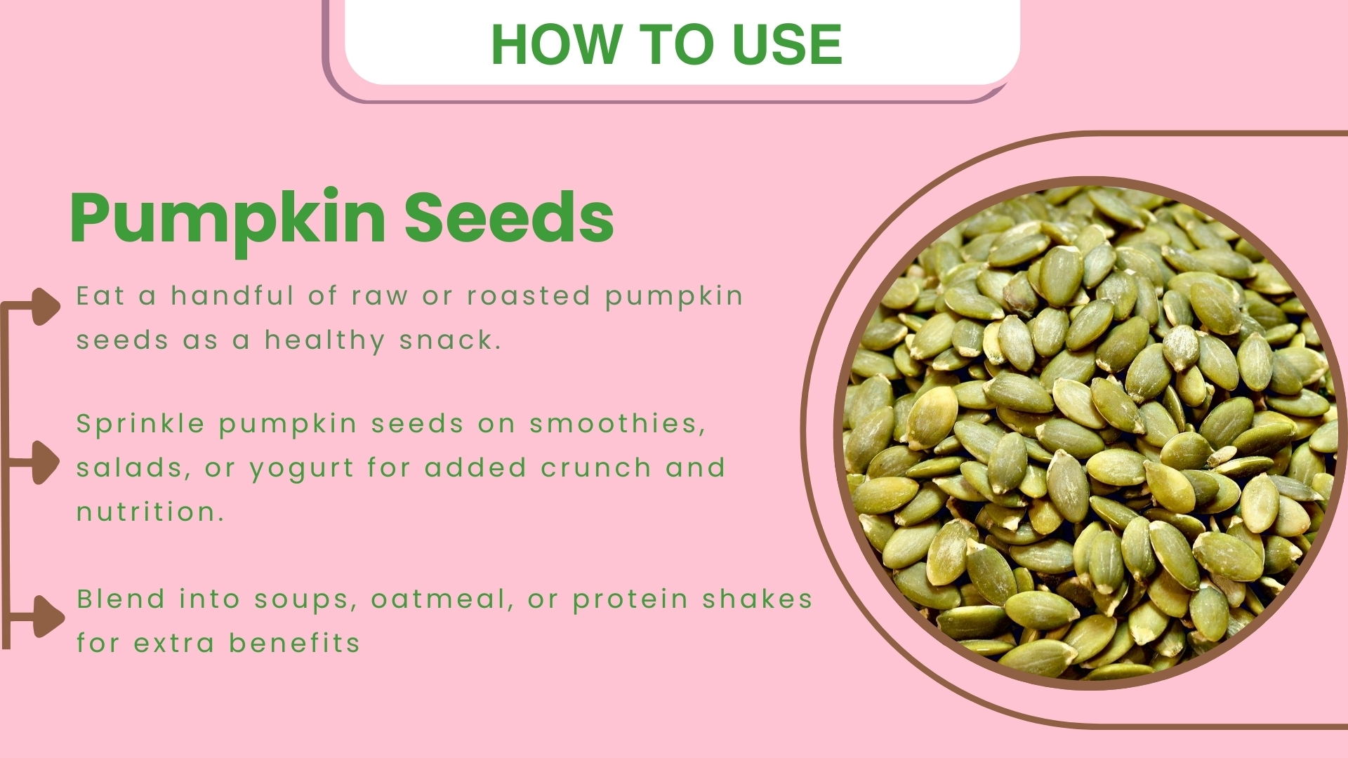 • Pumpkin seeds can be easily incorporated into your diet as a snack or ingredient in meals or baking.
