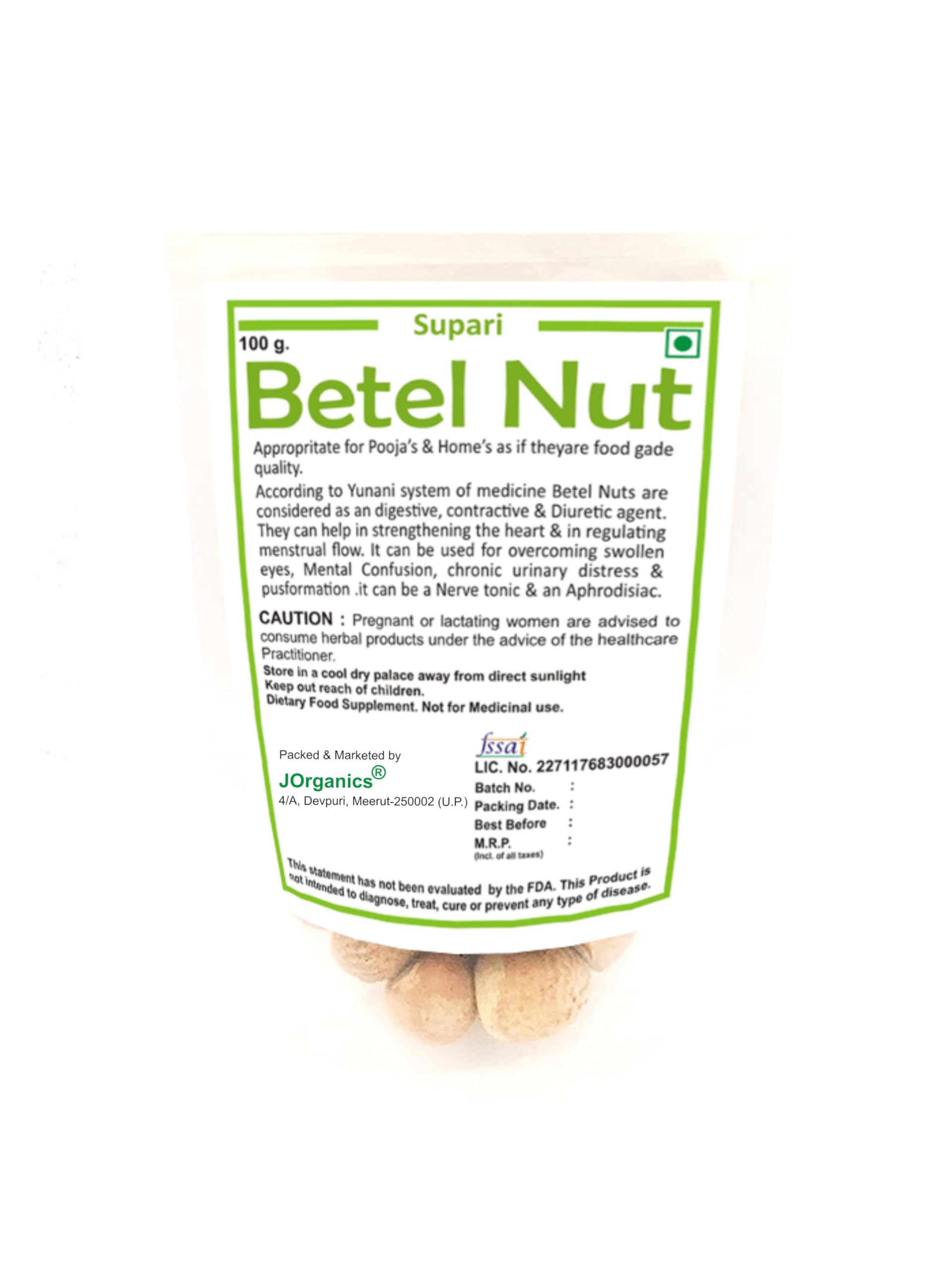 JOrganic Puja Supari is a 100-gram pack of whole areca nuts also known as betel nuts or satta supari. These nuts are grown organically and harvested at the peak of their freshness. They are then sun-dried to preserve their natural flavor and nutrients.JOrganic Puja Supari is a traditional ingredient used in Hindu pujas and religious ceremonies. It is also commonly chewed as a mouth freshener and digestive aid. The nuts have a slightly sweet and nutty flavor and they are said to have a number of health benefits including:Improving digestionBoosting energy levelsReducing stressSoothing sore throatsWhitening teethJ Organic Puja Supari is a natural and healthy product that can be enjoyed by people of all ages. It is a great way to add a touch of tradition to your pujas or to simply enjoy as a refreshing and invigorating snack.