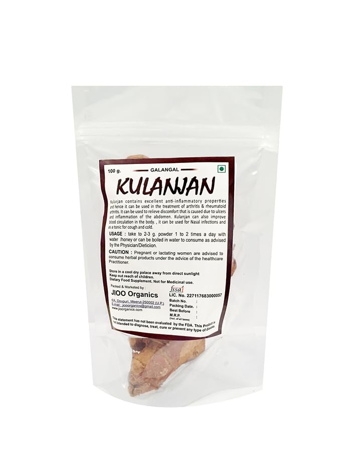 Unlock the power of nature with JOrganics Kulanjan (Galangal) Roots/Jad. Harvested with care and expertise these organic Kulanjan roots offer a treasure trove of health benefits. Known for centuries in Ayurveda for its medicinal properties Kulanjan is revered for its ability to promote digestive and respiratory health. Packed with potent antioxidants and essential nutrients including vitamins and minerals our Kulanjan roots are a natural health tonic for the body and mind. Whether used in teas soups or as a culinary spice Kulanjan adds a unique flavor and aroma to your dishes while supporting your overall well-being. With JOrganics you can trust that you're getting the purest and highest-quality Kulanjan roots free from additives or preservatives. Elevate your health and culinary experience with JOrganics Kulanjan (Galangal) Roots/Jad - the natural choice for holistic wellness. Order now and experience the goodness of nature!