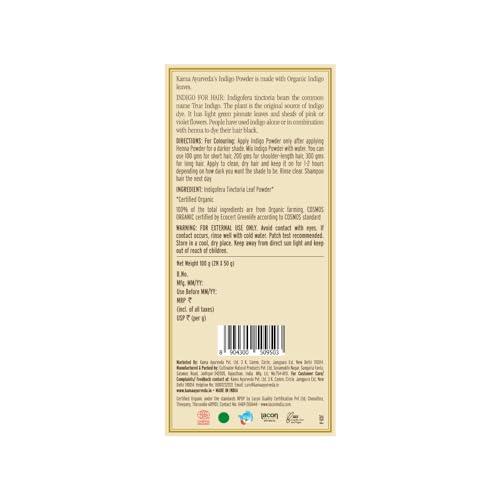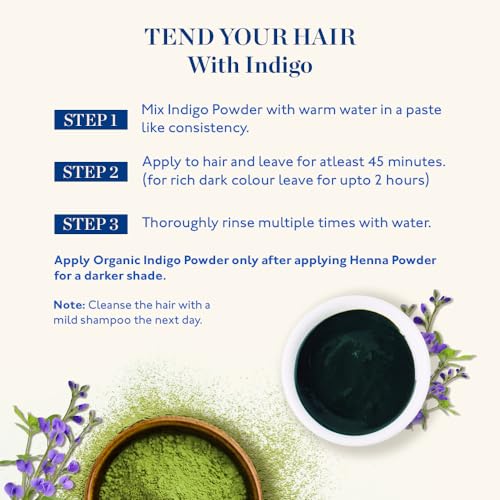 Design: Organic Indigo Powder Made from Organic Indigo plants this powder is a perfectly natural and chemical-free way to color hair a deep rich black color when used with Henna powder. Indigo powder is a highly pigmented powder that helps in covering greys volumizes hair strands and helps rebuild hair health and strength. While other hair colorant strip away essential nutrients from strands Indigo when combined with Henna is a safe and effective method to color hair black without compromising on hair integrity. Must be used with Henna powder only.