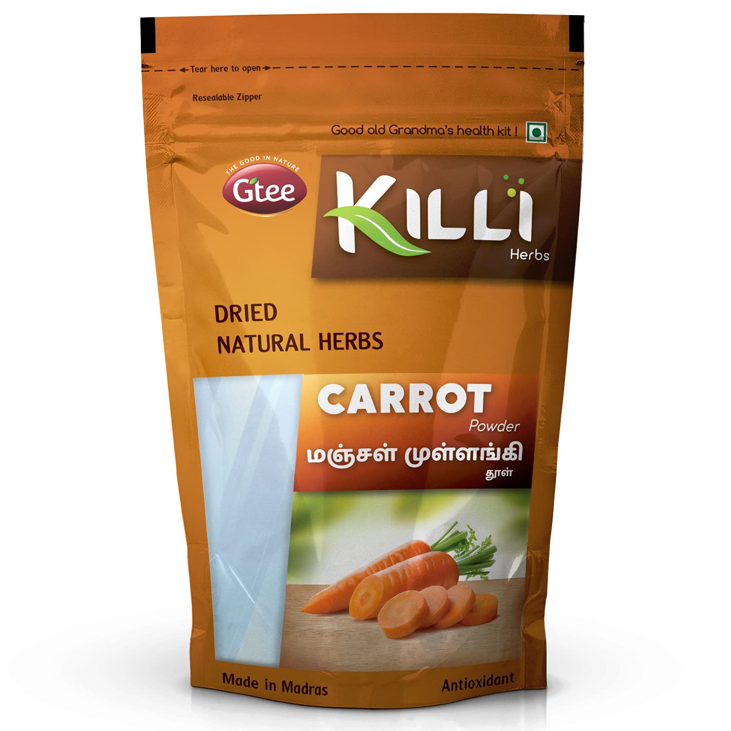 KILLI CARROT POWDERHEALTH BENEFITSCarrot is highly nutritious and rich in powerful antioxidants Vitamin A Vitamin K1 Potassium and Fibre.HOW TO MAKEMix one teaspoon (3-5g) of Killi Carrot powder to hot water or hot milk. Stir it well and serve. Add palm sugar to enhance the taste if required.KILLI HERBS & SPICESKILLI having its special care and scientific approach in every stop of processing of herbs to retain the active principle taste and aroma explores the value of traditional herbs with uncompromising quality and taste to customers. We believe that the traditional wisdom is the wealth of our Nation. KILLI's unique herbal combinations offers its customers the best healthy solutions. KILLI is a Registered Trademark of Gtee