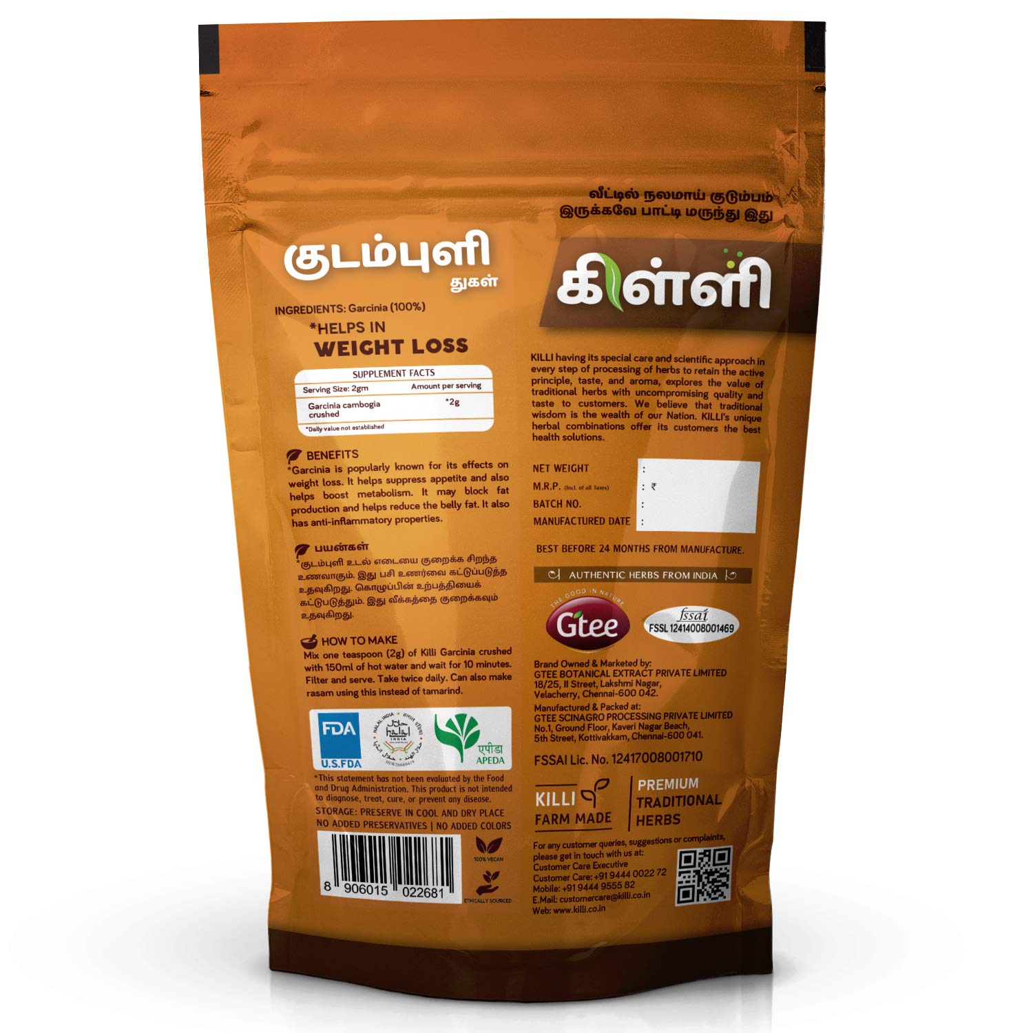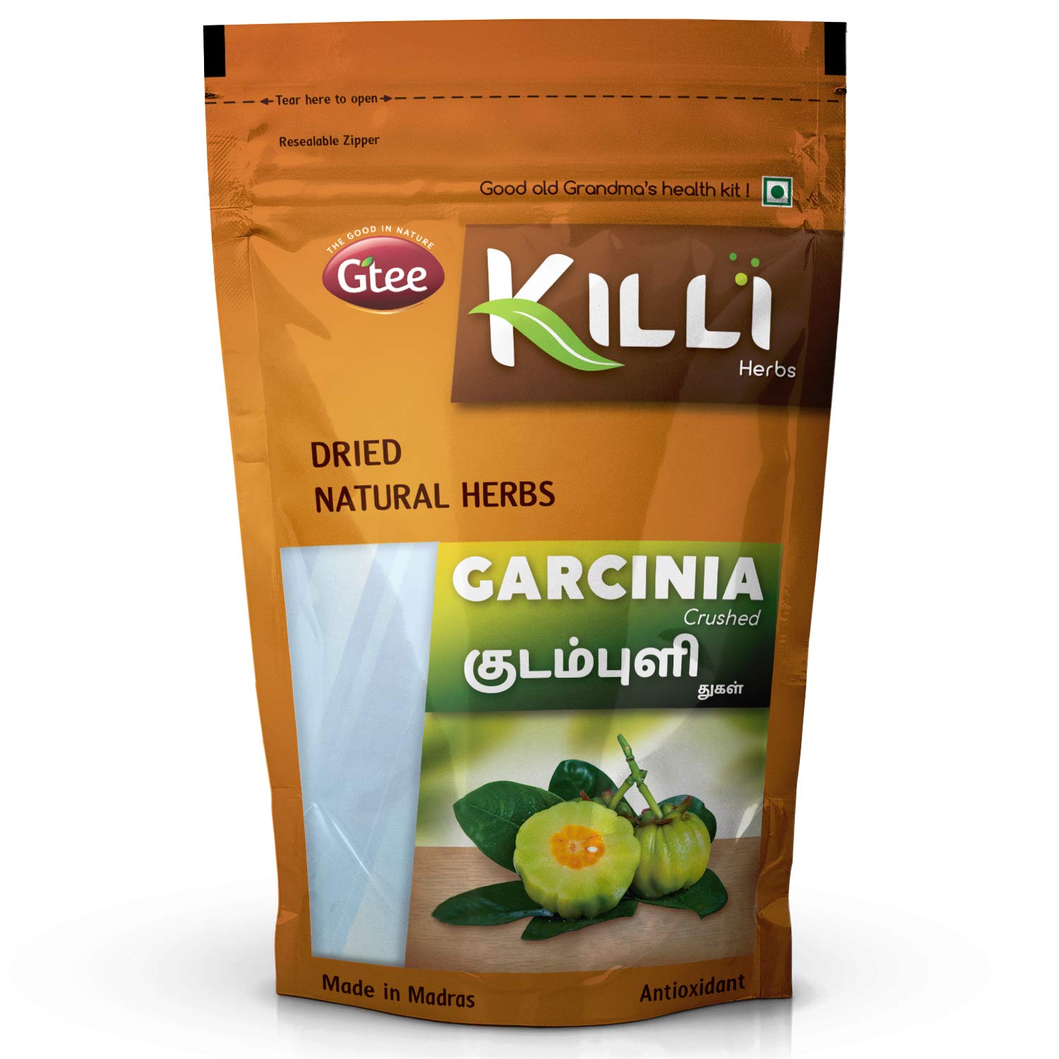KILLI GARCINIA CAMBOGIA CRUSHEDHEALTH BENEFITSGarcinia is popularly known for its effects on weight loss. It may block fat production and helps reduce the belly fat.HOW TO MAKEMix one teaspoon (2g) of Killi Garcinia crushed with 150ml of hot water and wait for 10 minutes. Filter and serve. Take twice daily. Can also make rasam using this instead of tamarind.KILLI HERBS & SPICESKILLI having its special care and scientific approach in every stop of processing of herbs to retain the active principle taste and aroma explores the value of traditional herbs with uncompromising quality and taste to customers. We believe that the traditional wisdom is the wealth of our Nation. KILLI's unique herbal combinations offers its customers the best healthy solutions. KILLI is a Registered Trademark of Gtee