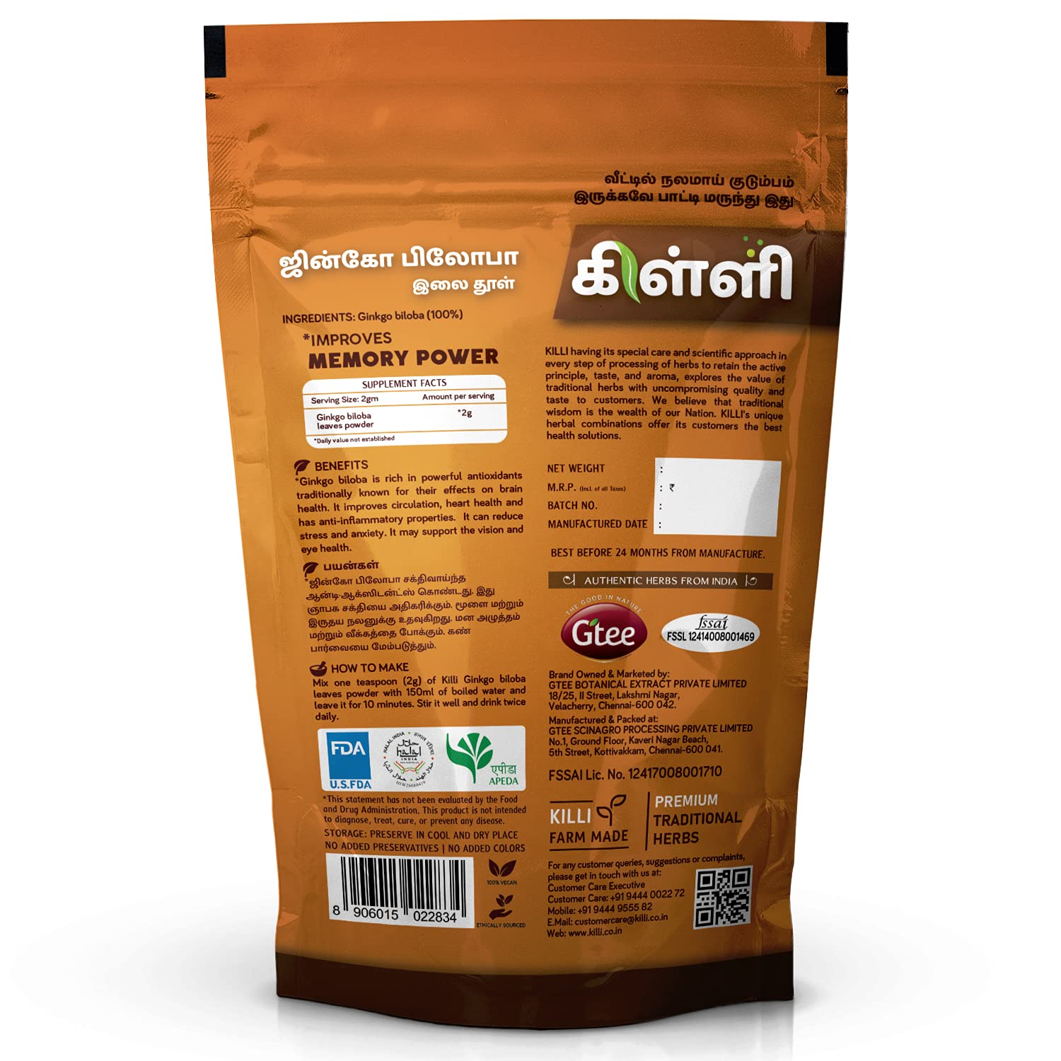 KILLI GINKGO BILOBA LEAVES POWDERHEALTH BENEFITSGinkgo biloba is rich in powerful antioxidants. It can reduce stress and anxiety.HOW TO MAKEMix one teaspoon (2g) of Killi Ginkgo biloba leaves powder with 150ml of boiled water and leave it for 10 minutes. Stir it well and drink twice daily. KILLI HERBS & SPICESKILLI having its special care and scientific approach in every stop of processing of herbs to retain the active principle taste and aroma explores the value of traditional herbs with uncompromising quality and taste to customers. We believe that the traditional wisdom is the wealth of our Nation. KILLI's unique herbal combinations offers its customers the best healthy solutions. KILLI is a Registered Trademark of Gtee
