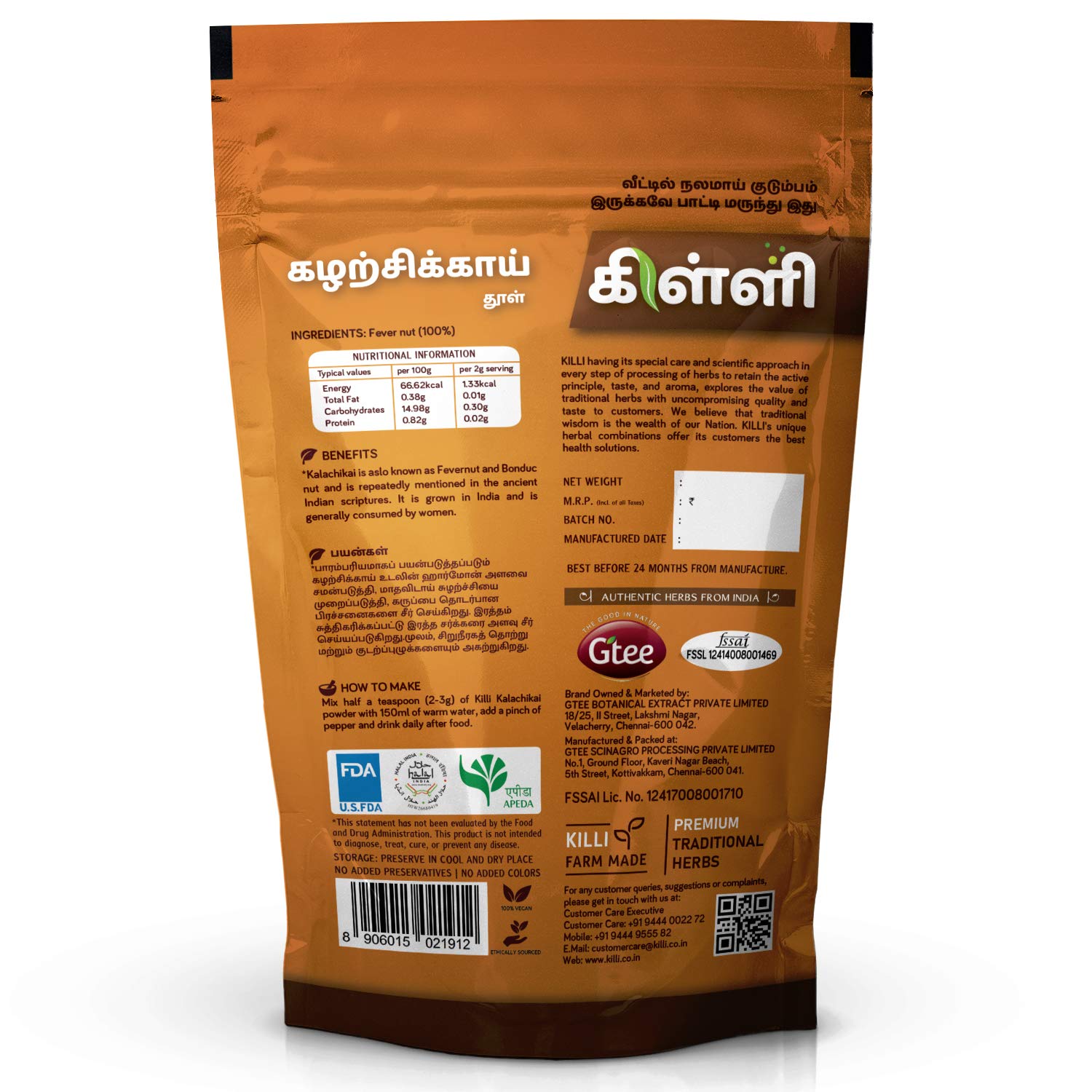 KILLI KALACHIKAI POWDERHEALTH BENEFITSKalachikai is aslo known as Fevernut and Bonduc nut and is repeatedly mentioned in the ancient Indian scriptures. It is grown in India and is generally consumed by women.HOW TO MAKEMix half a teaspoon (2-3g) of Killi Kalachikai powder with 150ml of warm water add a pinch of pepper and drink daily after food.KILLI HERBS & SPICESKILLI having its special care and scientific approach in every stop of processing of herbs to retain the active principle taste and aroma explores the value of traditional herbs with uncompromising quality and taste to customers. We believe that the traditional wisdom is the wealth of our Nation. KILLI's unique herbal combinations offers its customers the best healthy solutions. KILLI is a Registered Trademark of Gtee