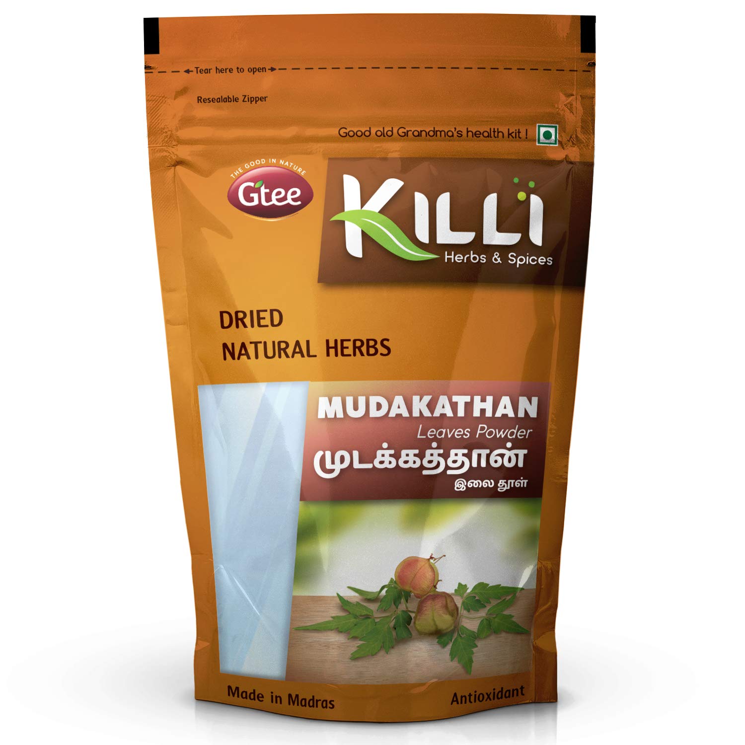 KILLI MUDAKATHAN LEAVES POWDERHEALTH BENEFITSMudakathan leaves is effective swollen joints. It is widely used for ear pain and discharge.HOW TO MAKEBoil one teaspoon (3-5g) of Killi Mudakathan powder with 150ml of water for 5 minutes filter and drink. Add salt and pepper to enhance the taste if required. Take twice weekly. It can be mixed with rice rasam dosa batter thuvaiyal and chutney. KILLI HERBS & SPICESKILLI having its special care and scientific approach in every stop of processing of herbs to retain the active principle taste and aroma explores the value of traditional herbs with uncompromising quality and taste to customers. We believe that the traditional wisdom is the wealth of our Nation. KILLI's unique herbal combinations offers its customers the best healthy solutions. KILLI is a Registered Trademark of Gtee