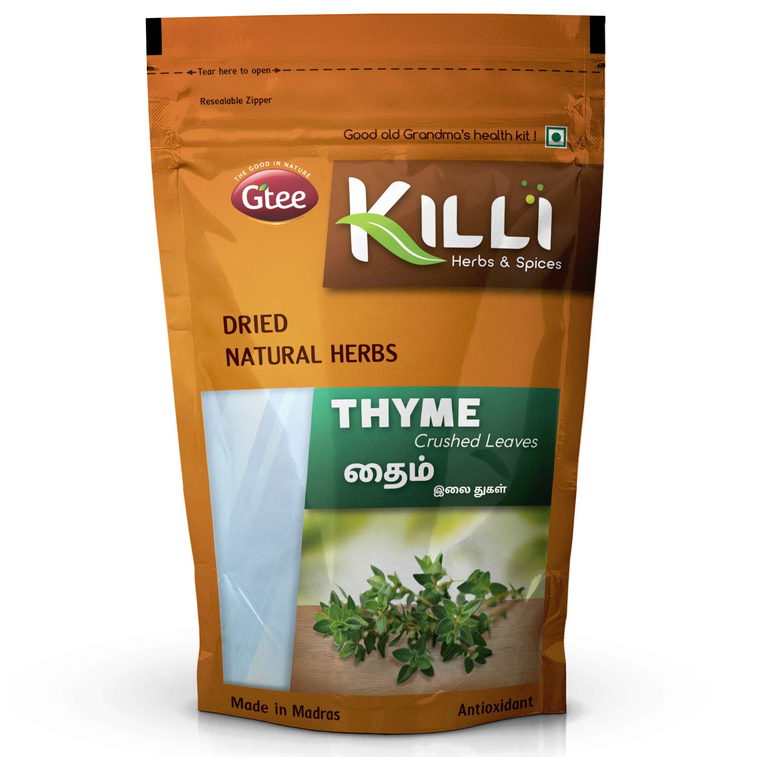 KILLI THYME LEAVES CRUSHEDHEALTH BENEFITSThyme is a flavourful herb that helps to relieve sore throat cold cough stomach pain flatulence and acts as an antioxidant. It helps increase urine flow and also acts as an appetizer.HOW TO MAKEMix 2g of Killi Thyme leaves with 150ml of hot water filter after 23 minutes and serve. Mix with Green Tea and Black Tea to give pleasant aroma. Can be added to season soups salads and sauces. To keep its fragrance and flavour intact thyme is generally added at the final stages in the recipes.KILLI HERBS & SPICESKILLI having its special care and scientific approach in every stop of processing of herbs to retain the active principle taste and aroma explores the value of traditional herbs with uncompromising quality and taste to customers. We believe that the traditional wisdom is the wealth of our Nation. KILLI's unique herbal combinations offers its customers the best healthy solutions. KILLI is a Registered Trademark of Gtee