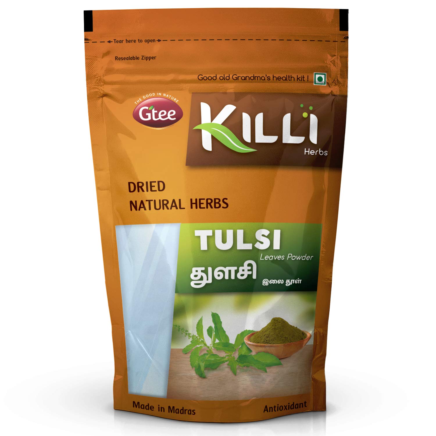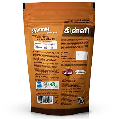 KILLI TULSI LEAVES POWDERHEALTH BENEFITSTulsi has miraculous healing effects and is considered as "The Queen of Herbs". It effectively improves immunity and protects our body. Helps reduce cold cough and relieve sore throat. Helps relieve congestion.HOW TO MAKEBoil half a teaspoon (3-5g) of Killi Tulsi leaves with 150ml of water for 2 minutes filter and serve hot.KILLI HERBS & SPICESKILLI having its special care and scientific approach in every stop of processing of herbs to retain the active principle taste and aroma explores the value of traditional herbs with uncompromising quality and taste to customers. We believe that the traditional wisdom is the wealth of our Nation. KILLI's unique herbal combinations offers its customers the best healthy solutions. KILLI is a Registered Trademark of Gtee