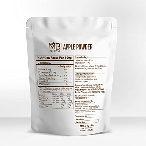 MB Herbals Apple Fruit Powder 250g | No Added Sugar and Preservatives | Milikshakes | Dessert Receipes Add delicious Apple flavor to : Cakes Candies and Chocolates Milk Shakes and Ice Creams Doghnuts and Desert Receipes Allergy information : This product is packed in a facility that handles tree nuts herbs and snacks.