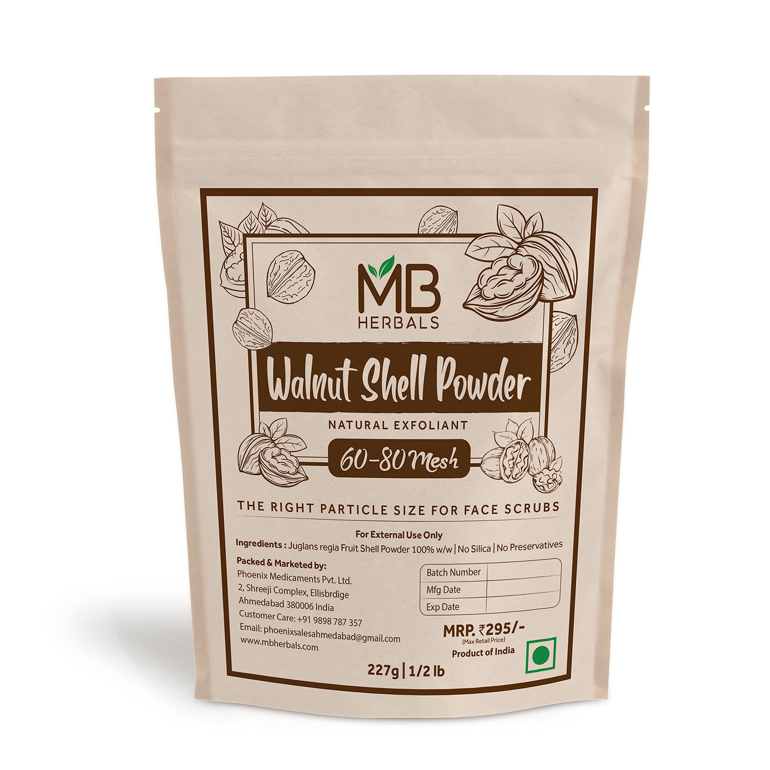 MB Herbals Walnut Shell Powder 227g Juglans regia Shell FOR EXTERNAL USE ONLY 100% Pure Walnut Shell Powder. No Silica or any additive. No Preservatives. This is a cosmetic Ingredient used to prepare Home-Made (DIY) Face Scrubs Exfoliants Foot Scrubs Peeling Creams Lotions etc. Walnut shell powder is one of the best natural abrasive. It is made using crushed walnut shells (outer hard skin of walnuts). Its free from any hazardous chemicals or silica or pesticides. MB Herbals Walnut Shell Powder passes through 60 Mesh. This is most suitable for preparing Scrubs Exfoliators and Peeling Lotions.