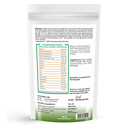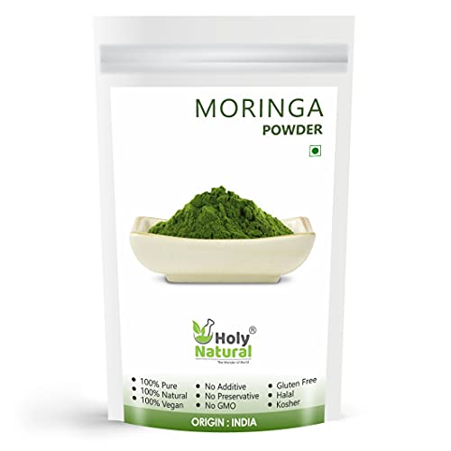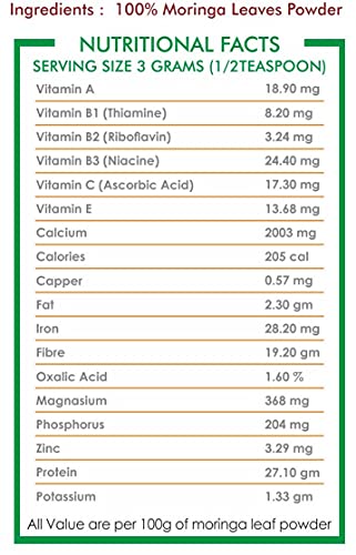 Moringa oleifera tree has been considered as one of the most nutritious plants ever discovered with most of its benefits concentrated in its small green leaves. It is an excellent source of minerals like iron calcium and vitamins a b b1 b2 b3 b6 c e as well as micro minerals trace minerals and phytonutrients. Moringa leaves powder boosts stamina lowers cholesterol it helps in removing toxins from the body improves immunity and so on. The benefits of moringa leaves powder are unending. Suggested use: take moringa leaves powder with water/soup/juice/tea and other beverages.
