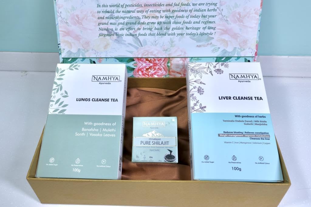 Namhya Men's Self Care Gift Hamper is the best way to detox and take care of body naturally because men need love and care too. Here's a special gift that you need to give to your brothers dads husbands and boy friends so that they feel energised everyday. This gift set contains pure herbal green teas and products in a beautiful floral gift box for your men's health and wellbeing.