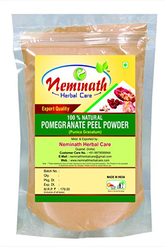Neminath Herbal Care 100% Natural Pomegranate Peel (Punica Granatum) Powder For Naturally (100Grams) Vitamin C another must have for which we often purchase expensive vitamin supplements are found in abundance in the pomegranate peel. Vitamin C is an extensive growth agent that helps heal wounds and form scar tissue. The ellagic acid contained in the pomegranate peel effectively prevents the moisture in your skin cells from drying out hence keeping your skin well hydrated and preventing dry skin which can ultimately lead to skin damage. Pomegranate peel is an effective sun block agent and helps prevent and repair damage caused to the skin by UVA and UVB sun rays.