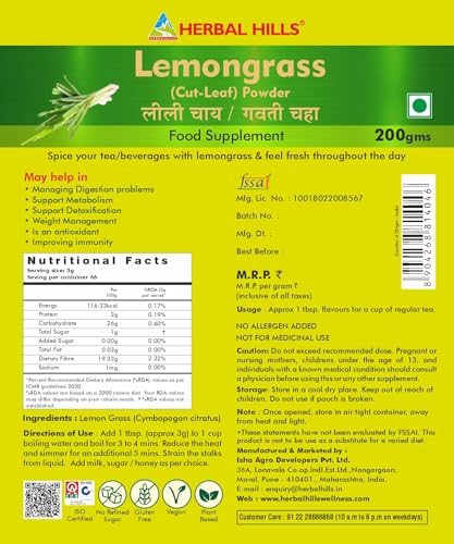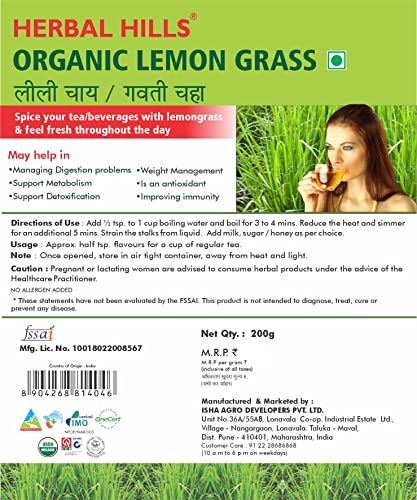 The lemongrass leaves are dried and is known for its refreshing and distinct lemon flavor. These lemongrass leaves are cultivated in the most suitable and chemical free environment at Herbal Hills using the traditional methods to retain their Ayurvedic value. This lemongrass can be alone used in tea or can be blended with other tea enhancers and beverages.