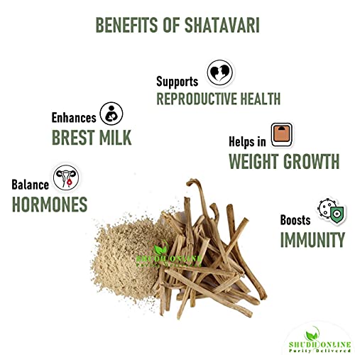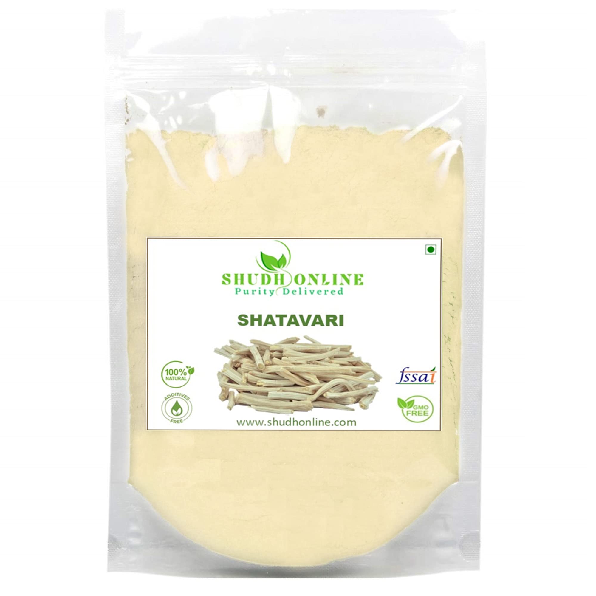 Shudh Online Shatavari powder supports health by toning and nourishing the female organs. Shatavari is also especially useful in nourishing and calming the body. Other names - Wild Asparagus Asparagus Root Shatavar Shatamuli Shatavarmul Shatavali Kilwari Shatapadi Satamuli Aheruballi Chatavali Kairuwa Narbodh Norkanto Satavari Satawar Satawari Satmooli Satmuli Shatamuli Shatavari Shatmuli Shimaishadavari Sitawari Shudh Online products are selectively sourced with great emphasis on purity and authenticity and are 100% natural ayurvedic products. We don't add any preservatives or additives in the product and using our product will get you closure to nature.
