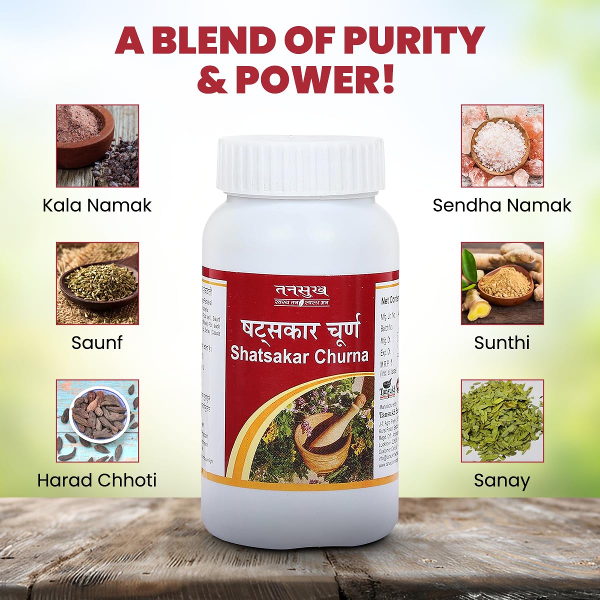 The key ingredients of Tansukh Shatsakar Churna are Kala namak Sendha Namak Saunf Sunthi Harad Chhoti Sanay.