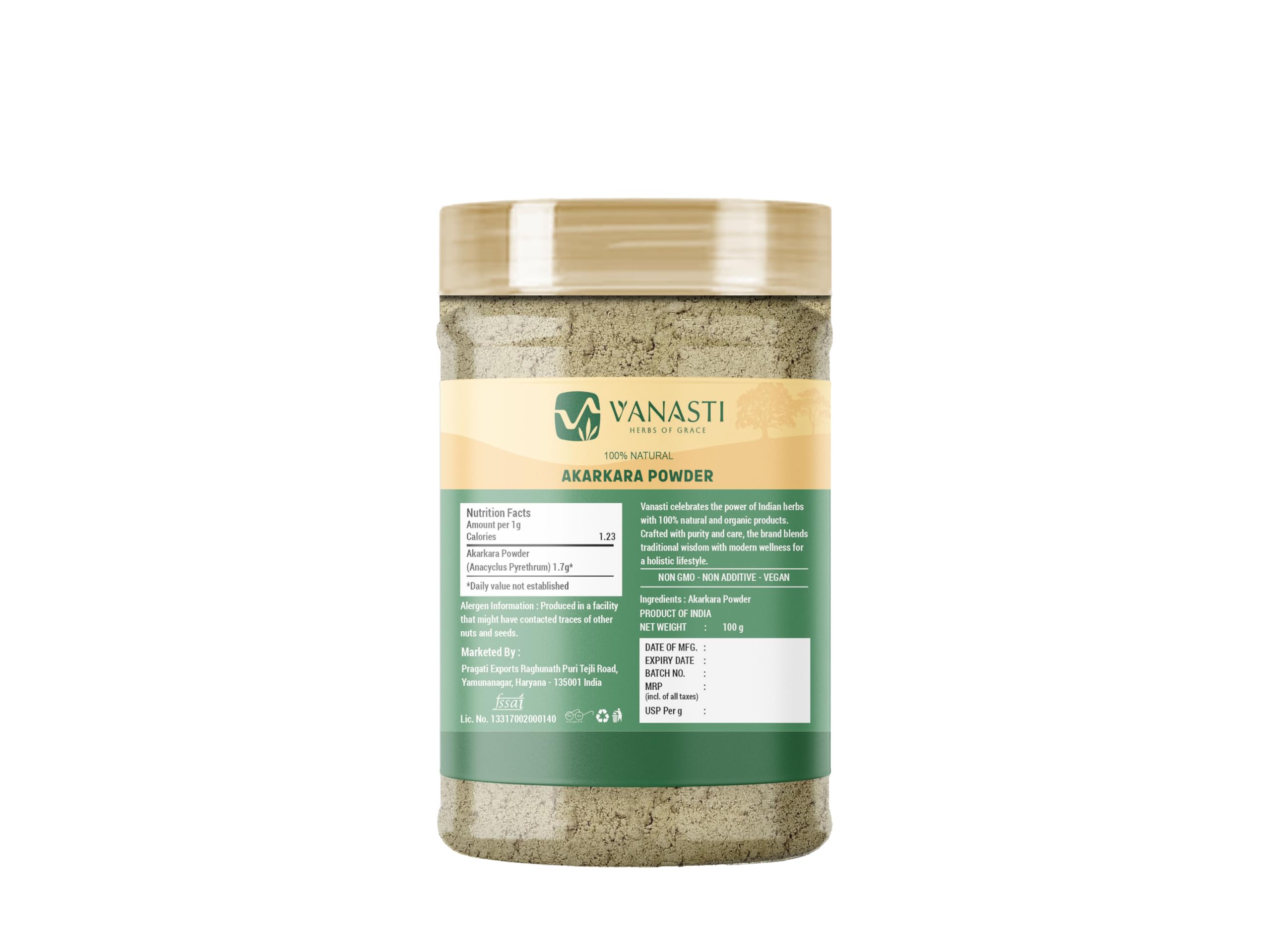 Akarkara Powder is made from the dried roots of the Anacyclus pyrethrum plant, also called Pellitory Root. This herb grows in parts of Europe, North Africa, and Asia and has daisy-like flowers with white petals and yellow centers. The roots are thick, brown, and known for their strong aroma and sharp taste. The powder is light brown and mixes easily into herbal or spice blends. It contains small amounts of natural minerals. Akarkara is mainly used for its bold, earthy flavor.